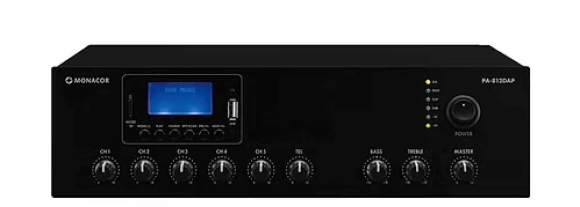 | Branchements | 1 x XLR (canal 1), 2 x jack 6,35 (canal 2-3) 2 x RCA D/G (canal 4-5), 1 x RCA (Amp In), 1 x RCA (Preamp Out), 1 x fiche F (FM/DAB+), contacts à vis (entrée Tel.,) contacts à vis (MOH), contacts à vis ( DC 24 V), contacts à vis (Mute), contacts à vis (haut-parleur) |