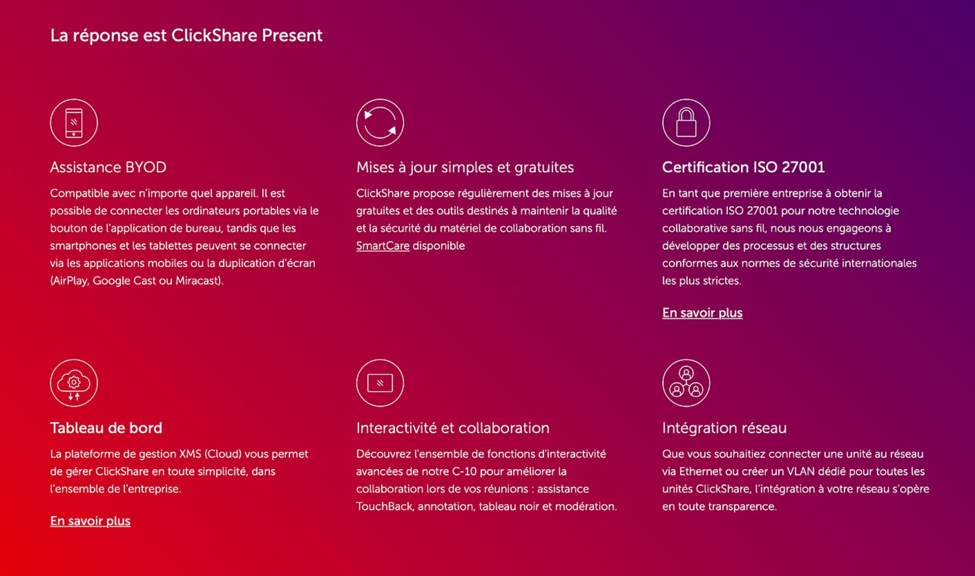 Conçu pour les déploiements en entreprise, le C-10 de qualité informatique vous propose des fonctions de sécurité avancées (certifiées ISO27001) et un grand nombre d’options de connectivité. Avec la plateforme XMS Cloud Management, vous bénéficiez de la gestion à distance des unités et d'analyses claires pour piloter votre lieu de travail numérique. Pour toute question pratique sur le déploiement sur le réseau de la gamme ClickShare Conference, consultez notre support technique ou contactez votre interlocuteur Barco.