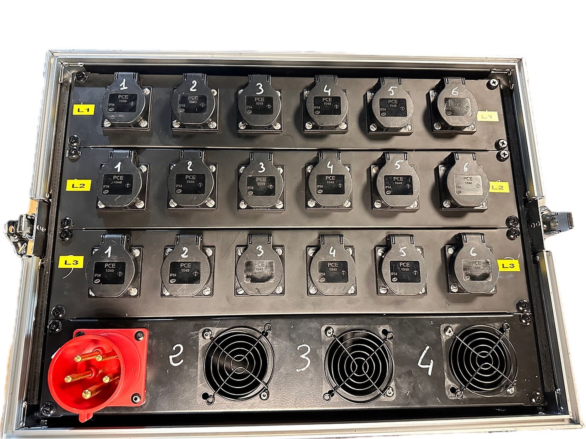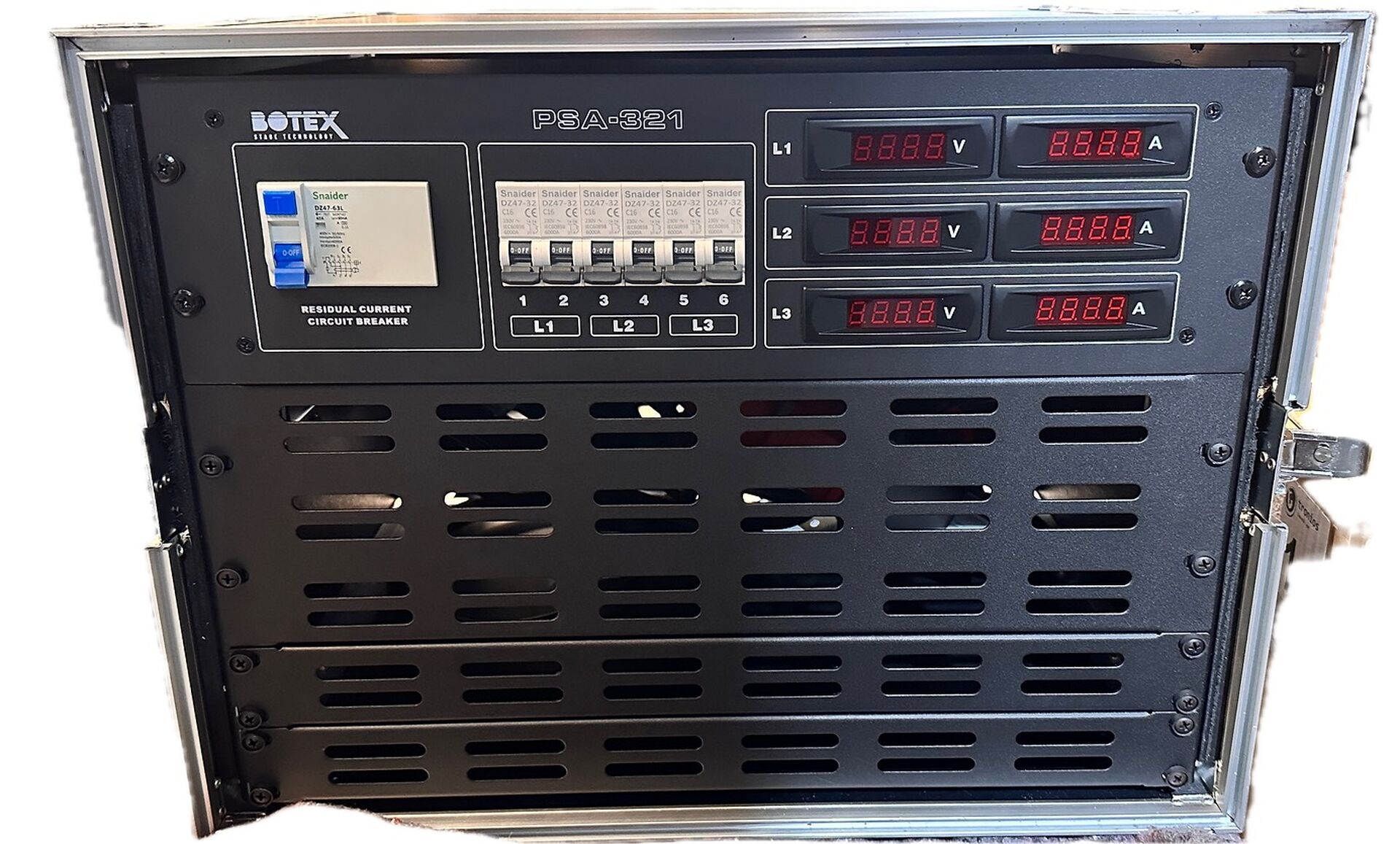 Le PSA-3212-S de Showtec répartit 3 x 32 A sur 12 groupes (3 x 4), avec 12 fusibles automatiques. 3 voltmètres et 3 ampèremètres sont situés à l’avant pour consulter la tension et le courant. À l’arrière, 12 connecteurs Schuko (3 groupes de 4) sont disponibles avec un max. de 32 A par groupe (voir schéma A). De plus, un disjoncteur de courant résiduel et un connecteur Schuko supplémentaire sont présents. Le boîtier en métal robuste 19'' x 4U, avec revêtement en peinture poudrée, est doté d’un câble d’1 mètre et d’un connecteur 3 x 32 A.