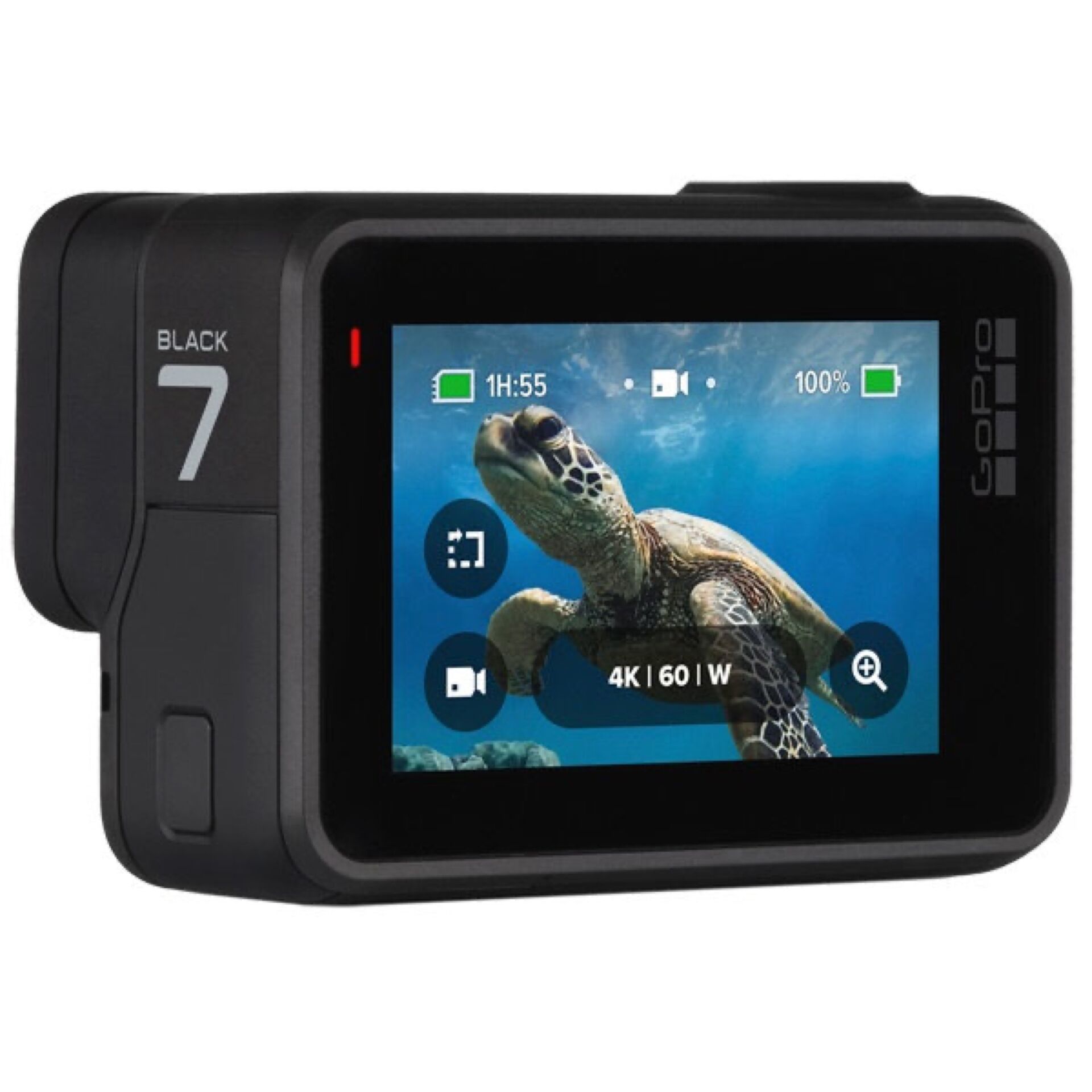 La HERO 7 Black Edition est la plus perfectionnée des GOPRO avec des vidéos en 4K à 60 images/s, des ralentis jusqu'à 240 images/s en 1080p, un mode photos à 12MP, une étanchéité jusqu'à 10 m sans caisson supplémentaire et un écran LCD tactile intégré de 2".