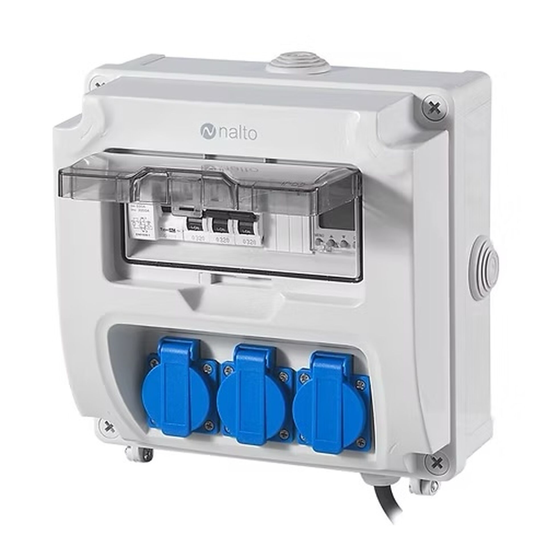 - 3 prises de courant 230V~, 2P+T, IP54, 16A avec fermeture à clapet