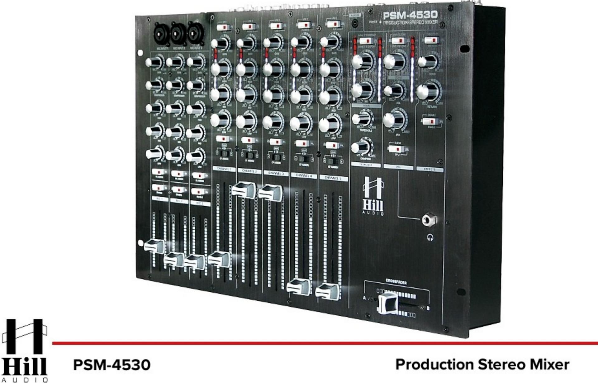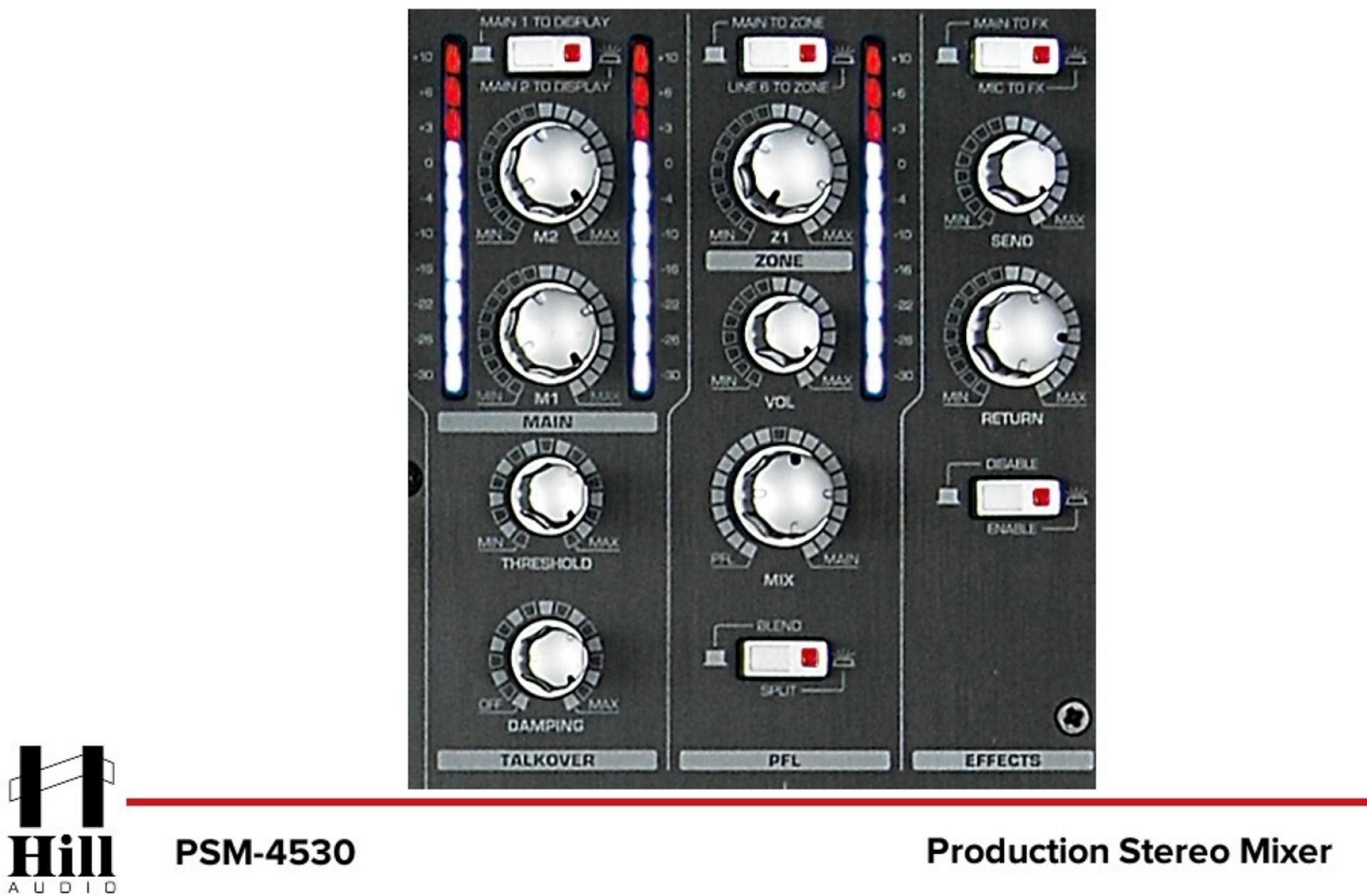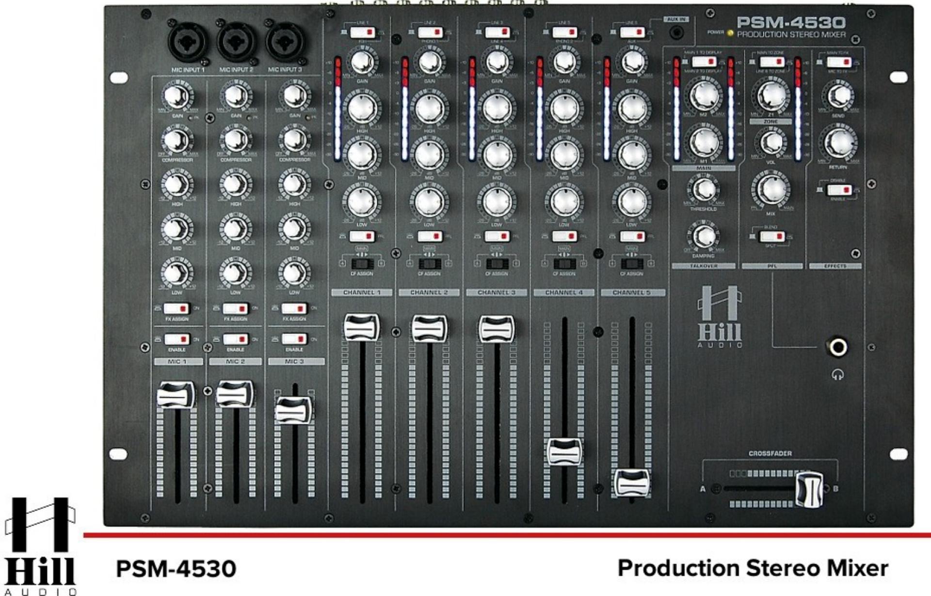 PSM-4530 - Mixer professionnel à 3 zones parfaitement équipé avec 3 entrées micro et 5 lignes à double affectation, compresseurs, crossfader, deux zones master stéréo, une zone mono indépendante et une sortie de subbass avec un diviseur de fréquence réglable intégré. Le mixer idéal pour club, DJ ou sonorisation multi-zone.