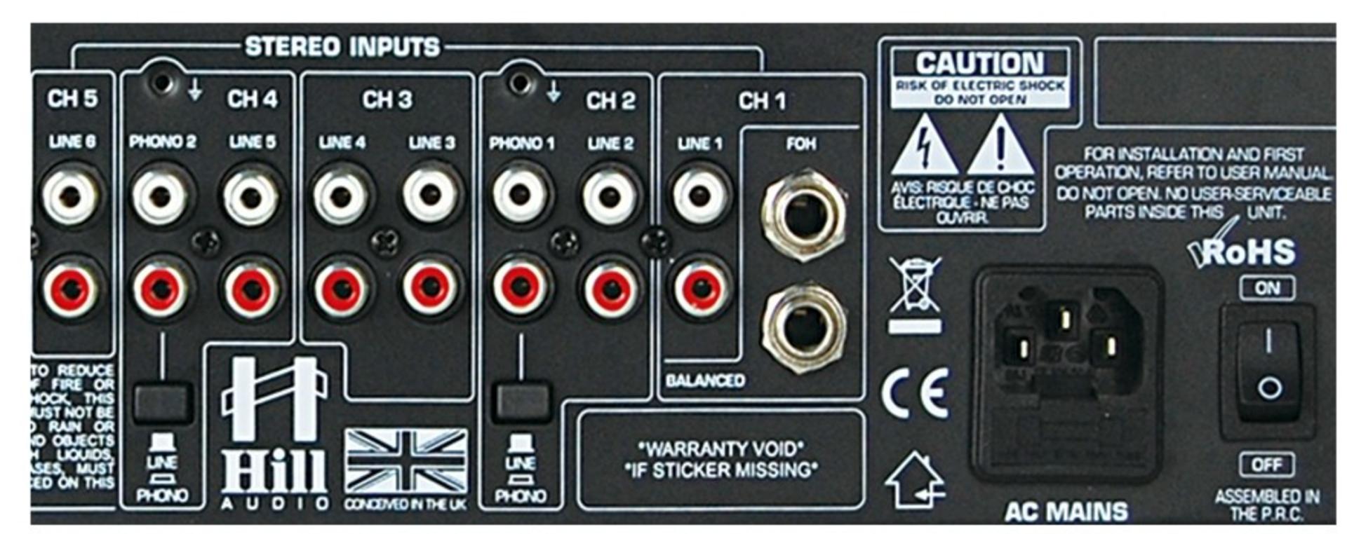 - 1 entrée FOH (ligne) pour la connexion d'un submixer, d'un juke-box, etc. La connexion s'effectue via des prises Jacks symétriques de 6,3 mm.