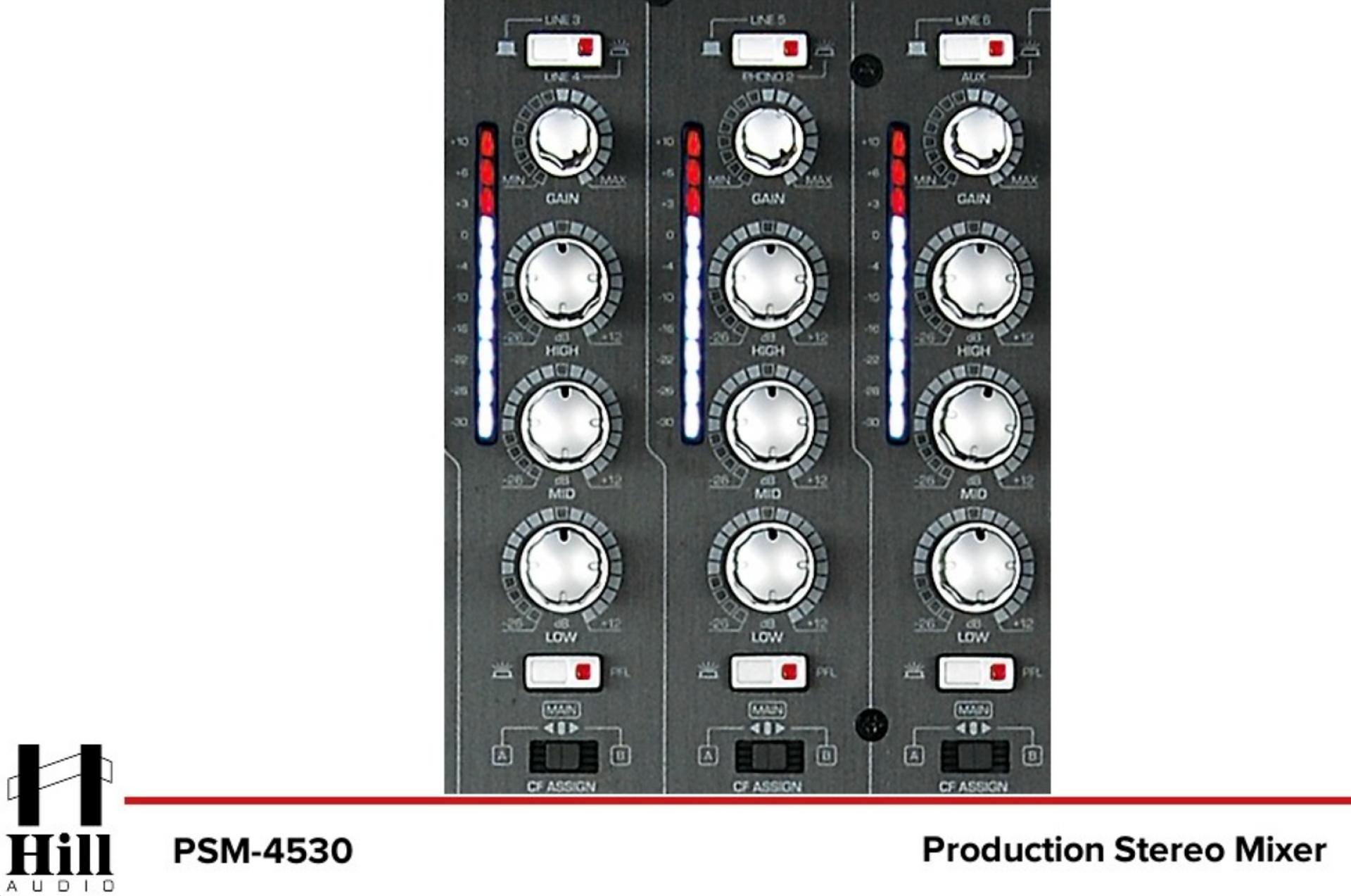 - 5 entrées ligne stéréo, toutes commutables et doublement assignables, 2 pouvant être commutées d'une sensibilité de ligne à une sensibilité de lecteur phono/tourne-disque. Toutes les entrées sont équipées d'un contrôle de niveau (gain), d'un indicateur de niveau de LED à 10 positions, d'un EQ à 3 bandes, d'une touche PFL (pré-écoute), assignables directement à la sortie master/sortie principale ou via le crossfader et de curseurs à double rail de haute qualité extra longs de 100 mm.