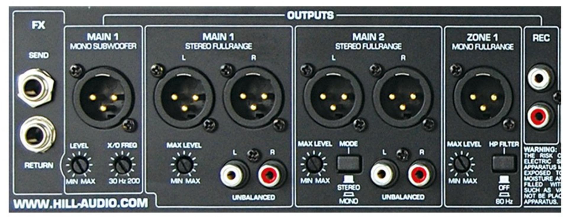- Sortie stéréo master 1 - Réglage de volume, sorties XLR/M G/D symétriques, sortie RCA G/D asymétrique, trimmer pour niveau de sortie max.