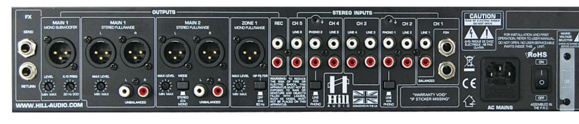 - Sortie stéréo master 2 - Réglage de volume, commutateur stéréo/mono, sorties XLR/M G/D symétriques, sortie RCA G/D asymétrique, trimmer pour niveau de sortie max.