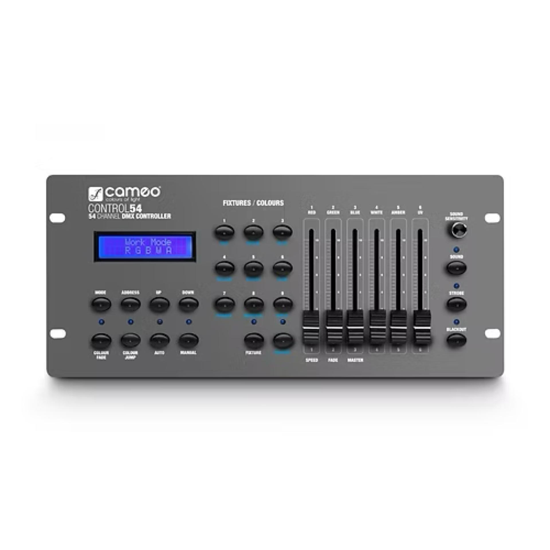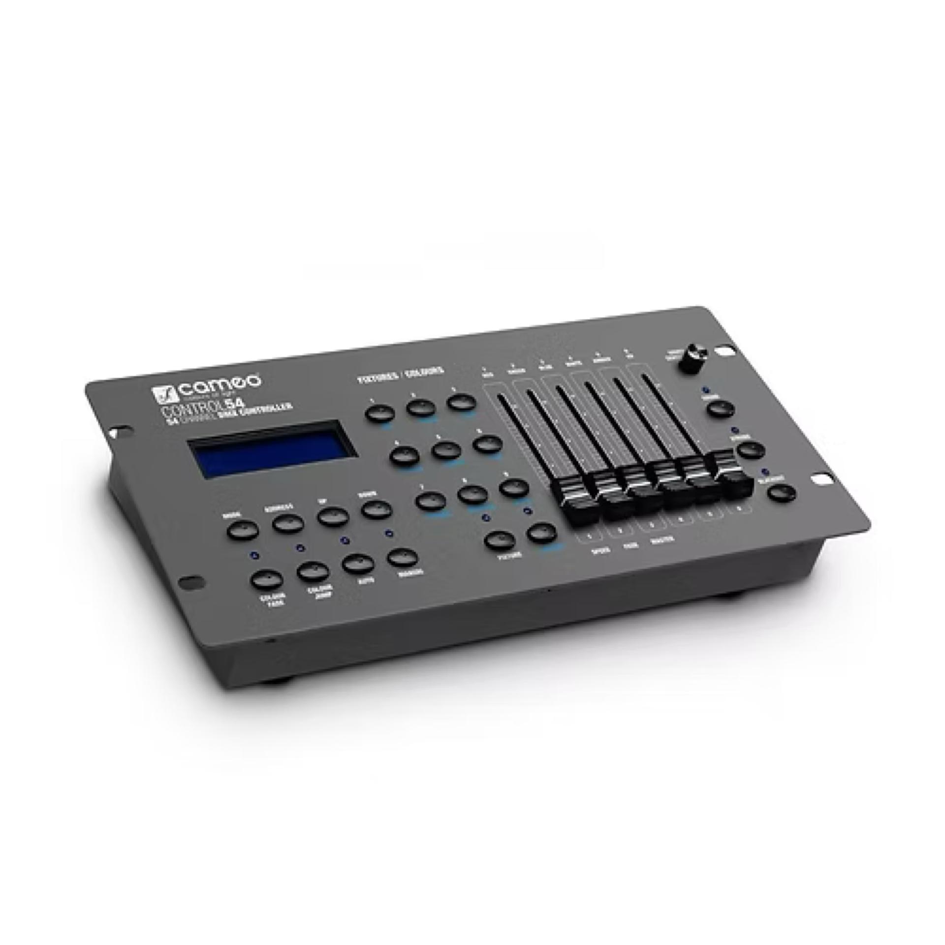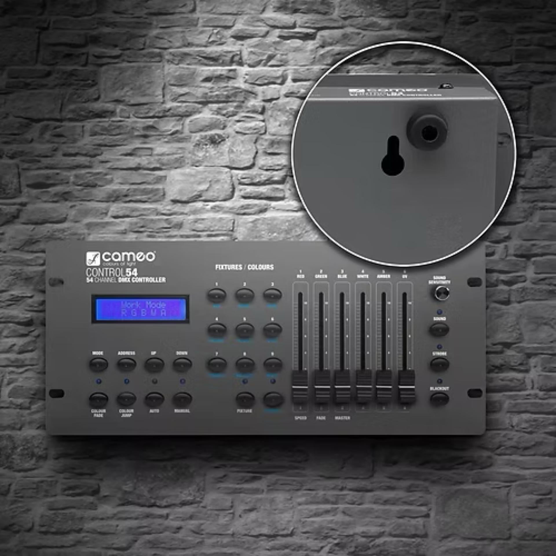 Le Control 54 est un pupitre-contrôleur DMX compact, permettant de piloter jusqu’à 9 projecteurs ou groupes de projecteurs. D'une grande polyvalence, ce contrôleur s’utilise de façon simple et intuitive ; il est idéal pour les DJ, clubs, bars, foyers... Il comprend 9 presets de couleurs, dont les touches peuvent aussi servir à la sélection des projecteurs ; ses 6 faders permettent de régler les doses de composantes rouge, verte, bleue, blanche, ambre et UV (lumière noire).