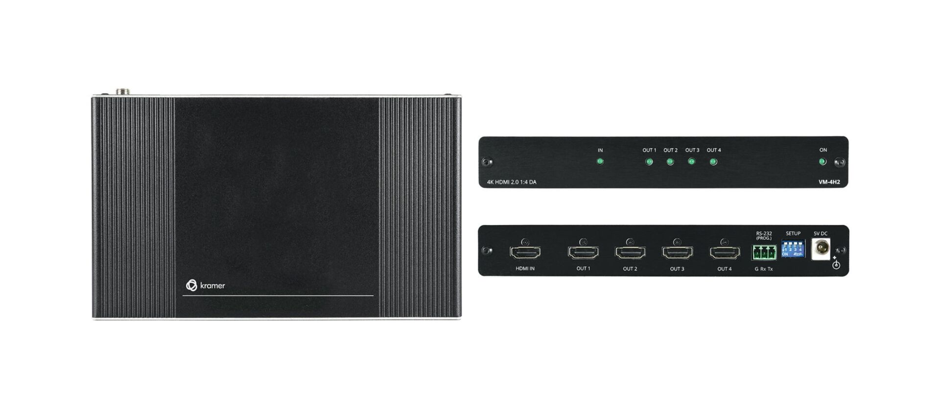 Le VM−4H2 est un distributeur amplificateur pour signaux HDMI 4K HDR conforme au standard de protection du contenu HDCP 2.2. Le produit accepte une entrée HDMI, reclock et égalise le signal et le distribue sur 4 sorties identiques.