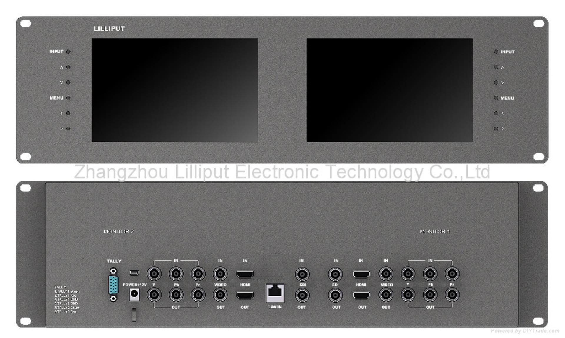 LILLIPUT RM-7028S moniteur à double 7" écrans à 1280x800 IPS contraste 800:1 au modèle 3RU rackmount avec double entrées de 3G-SDI Spécification : Panneau : 7" LED IPS Luminosité : 400 cd/m2 Résolution physique : 1280x800 Contraste : 800 :1 Rapport d'aspect : 16 :9 Angle de vue : 178°/178°(H/V) Signaux d'entrée : 3G-SDI x2 HDMI x2 YPbPr x6(BNC) Composite x2 Tally x2 LAN x1(arrivée immédiate) USB 2,0 pour l'entrée x 1(mini) Signaux de sortie : 3G-SDI x2 HDMI x2 YPbPr x6(BNC) Composite x2 Puissance: currant 1500mA/ Volag: DC12 Consommation d'énergie : ≤18W Température de fonctionnement : -20℃~60℃ Température de stockage : -30℃~70℃ Poids : Approximatif. 2885g Dimension : 482,5 x133,5x25,3mm Précautions Veuillez éviter l'impact lourd ou le faire tomber. Pas de nettoyage par des solutions chimiques, veuillez le maintenir légèrement en chiffon doux et propre. Suivrez l'instruction pour le dépannage, tous les ajustements doivent être faits par techniciens qualifiés. Contenu de livraison 1x Lilliput 7" 3U Rackmount Moniteur à double écrans 1x Adaptateur de câble pour alimentation (Modèle: FJ-SW202000E. Entrée: 100-240V~50/60Hz 0,6A, sortie:12V-2000mA) 1x sac de petites pièces de fixation 1x manuel d'instruction anglais