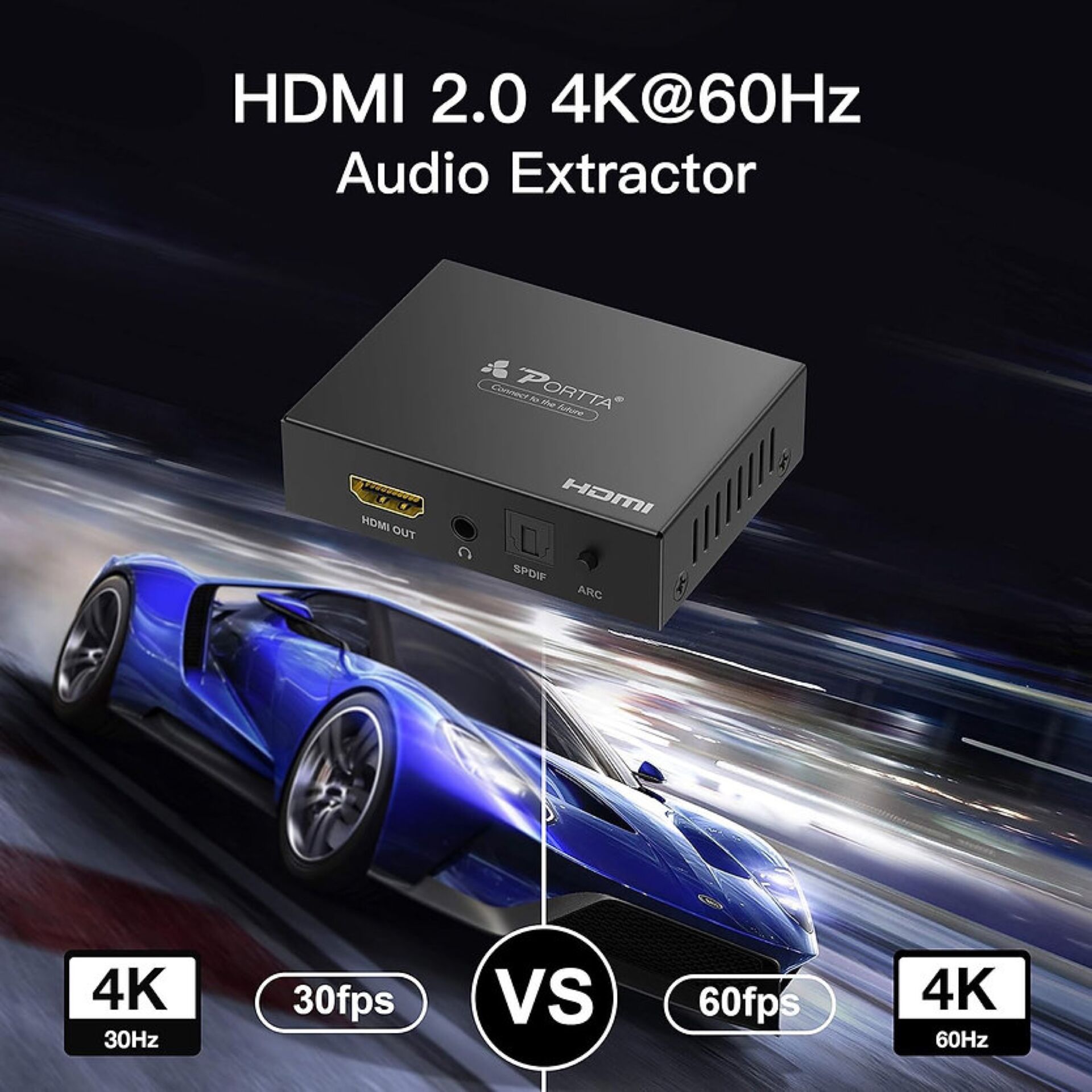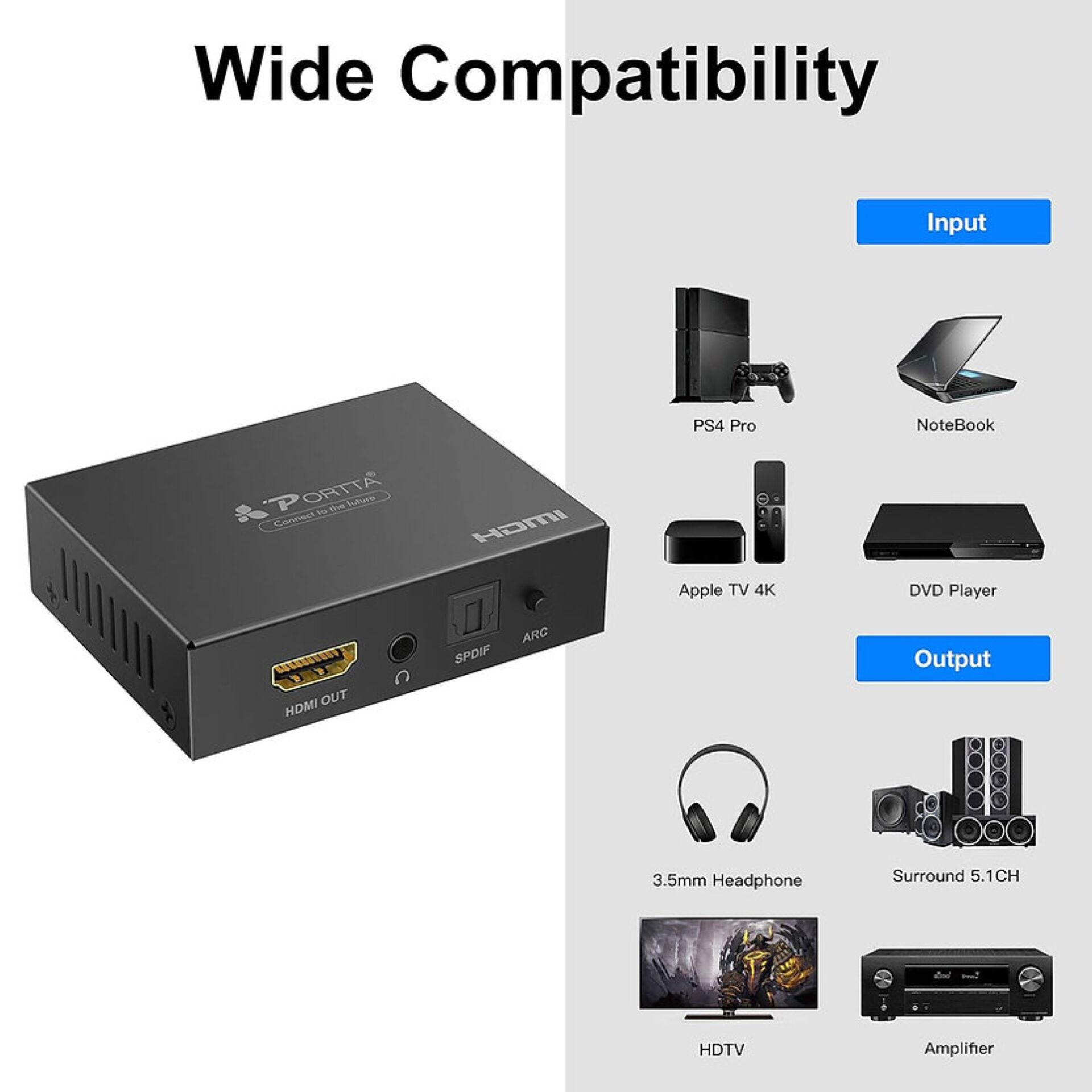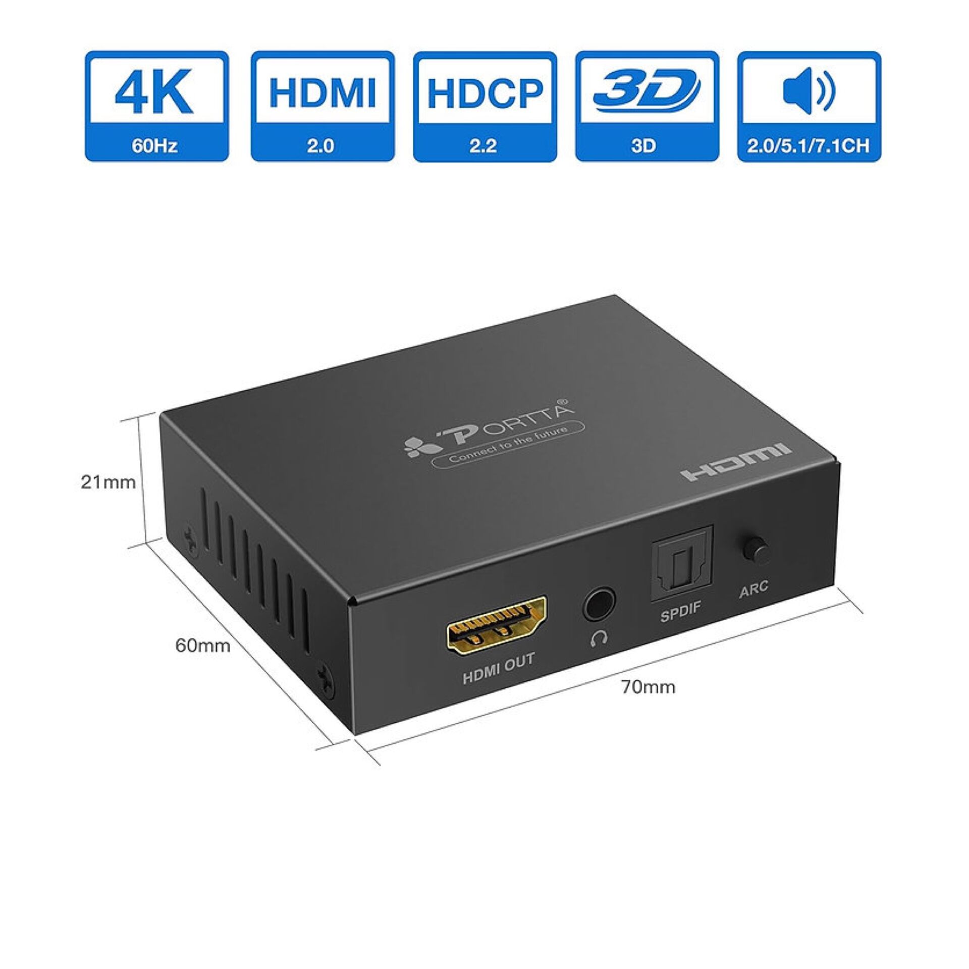 PORTTA HDMI Extracteur Audio 4K@60Hz HDMI vers HDMI+Audio (Optique SPDIF + RCA stéréo/3,5 mm) Convertisseur 2.1CH 5.1CH Extracteur Audio HDMI 4Kx2k