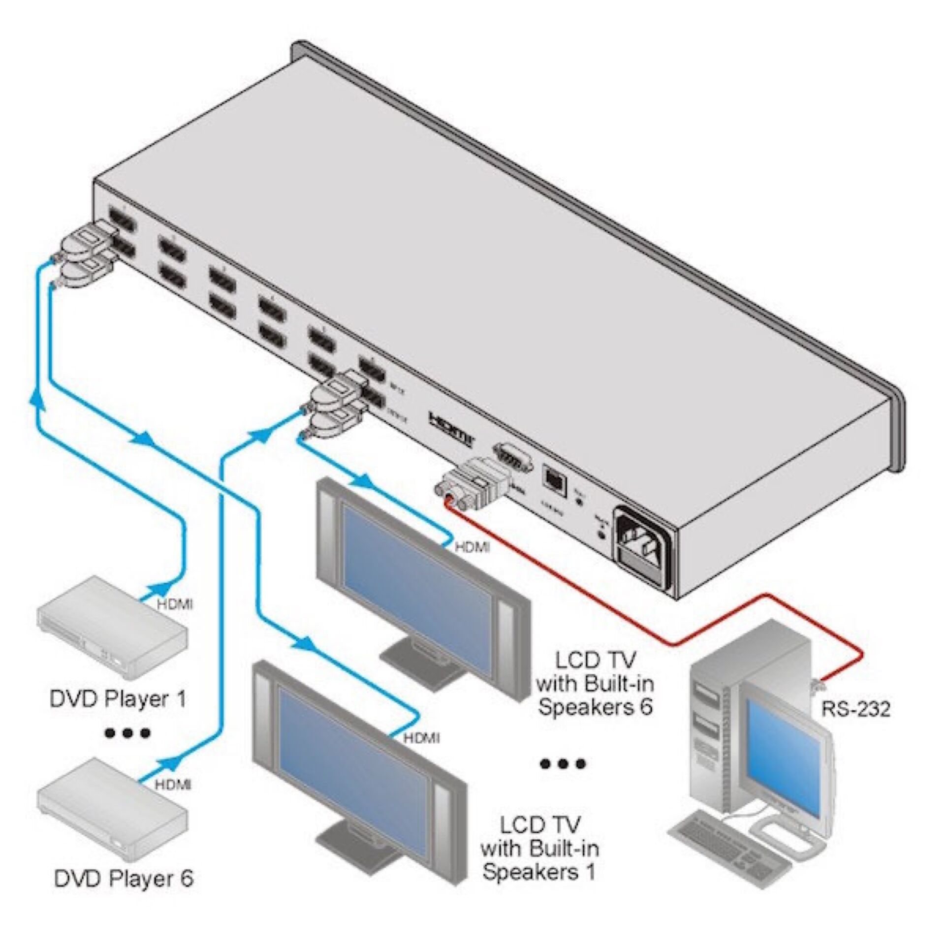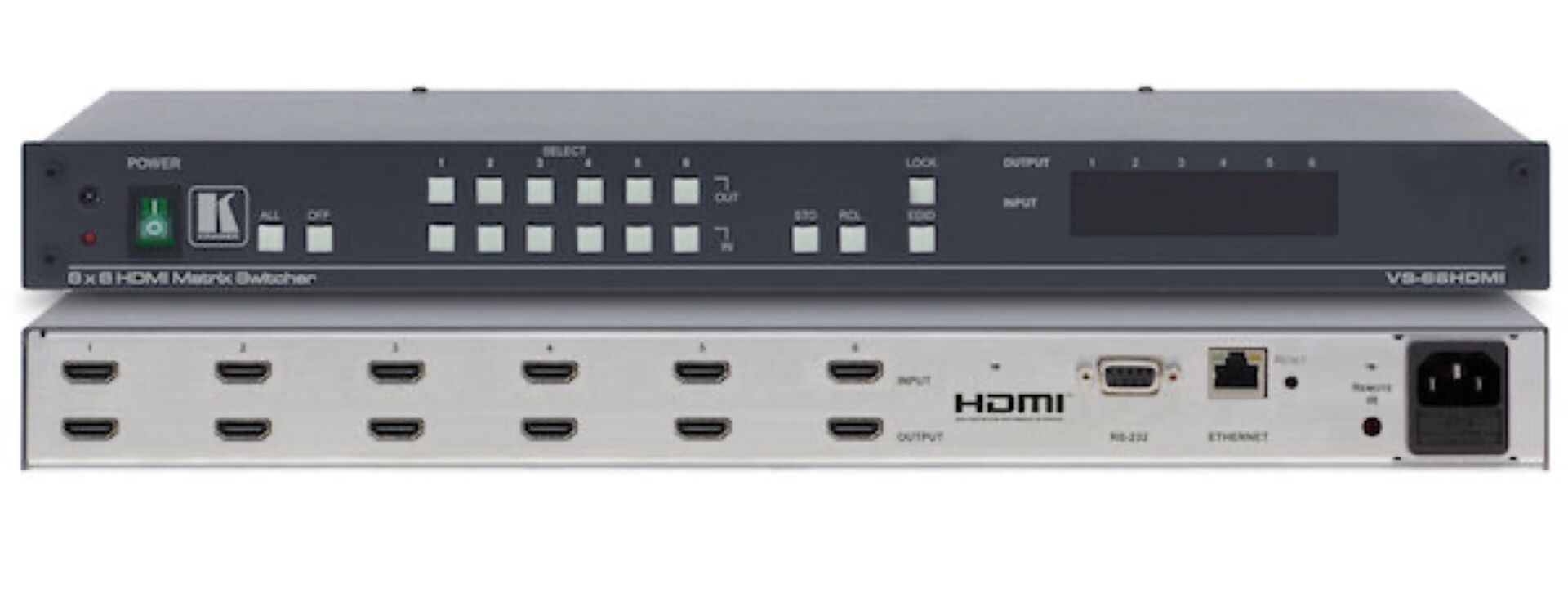 The VS-66HDMI is a high-performance matrix switcher for HDMI signals. It reclocks and equalizes the signal and can route any input to any or all outputs simultaneously.