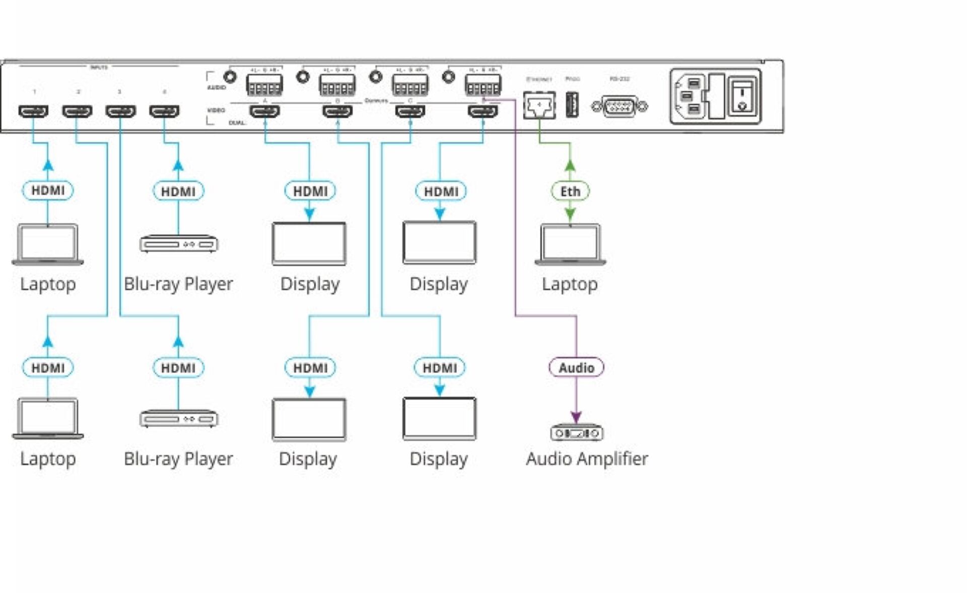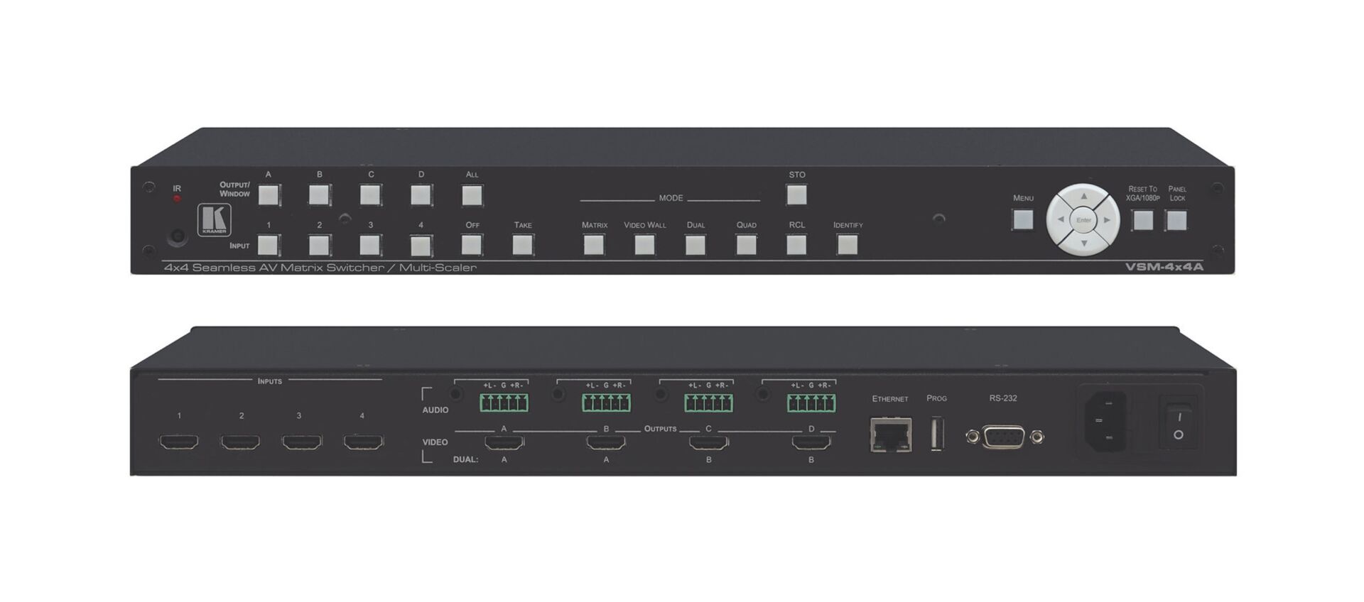 La VSM−4x4A est une grille de commutation 4x4 possédant la fonction mur d’images (2x2 ou 1x4) ou multiviewer double ou quad. La VSM−4x4A supporte les résolutions HDMI avec deep color, jusqu'à huit canaux audio et inclut les réglages HDCP et EDID.