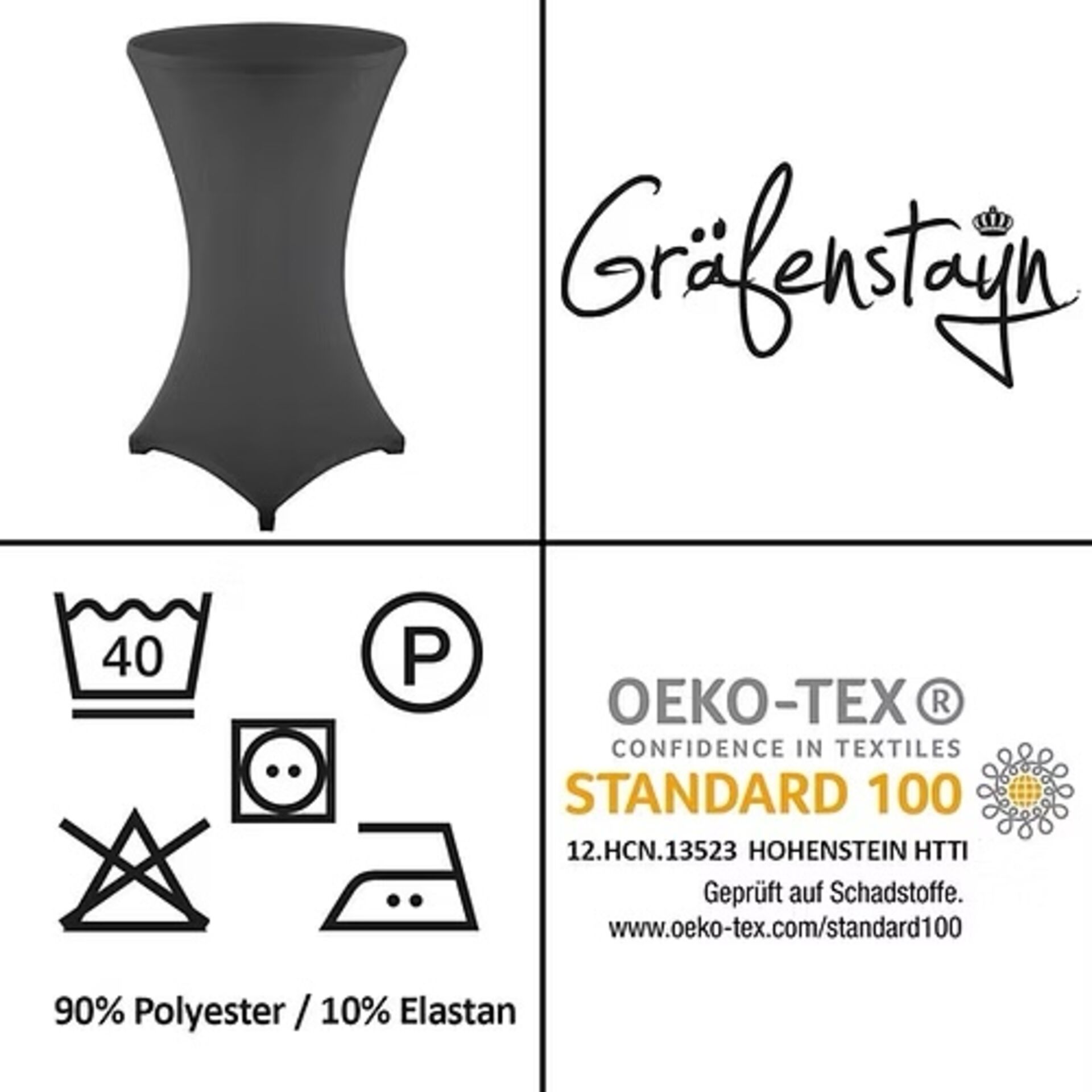 • La housse de table haute Diana griffée Gräfenstayn est fabriquée en tissu élastique, robuste, durable et facile d'entretien. Certification selon le STANDARD 100 Öko-Tex : certifiée par l'Institut Hohenstein (numéro de contrôle 12.HCN.13523)