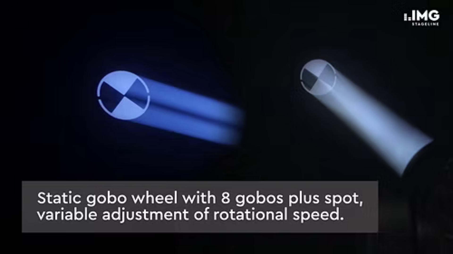 | Roue de gobos | roue de gobos statique : 8 gobos plus Spot roue de gobos tournante : 6 gobos plus spot |