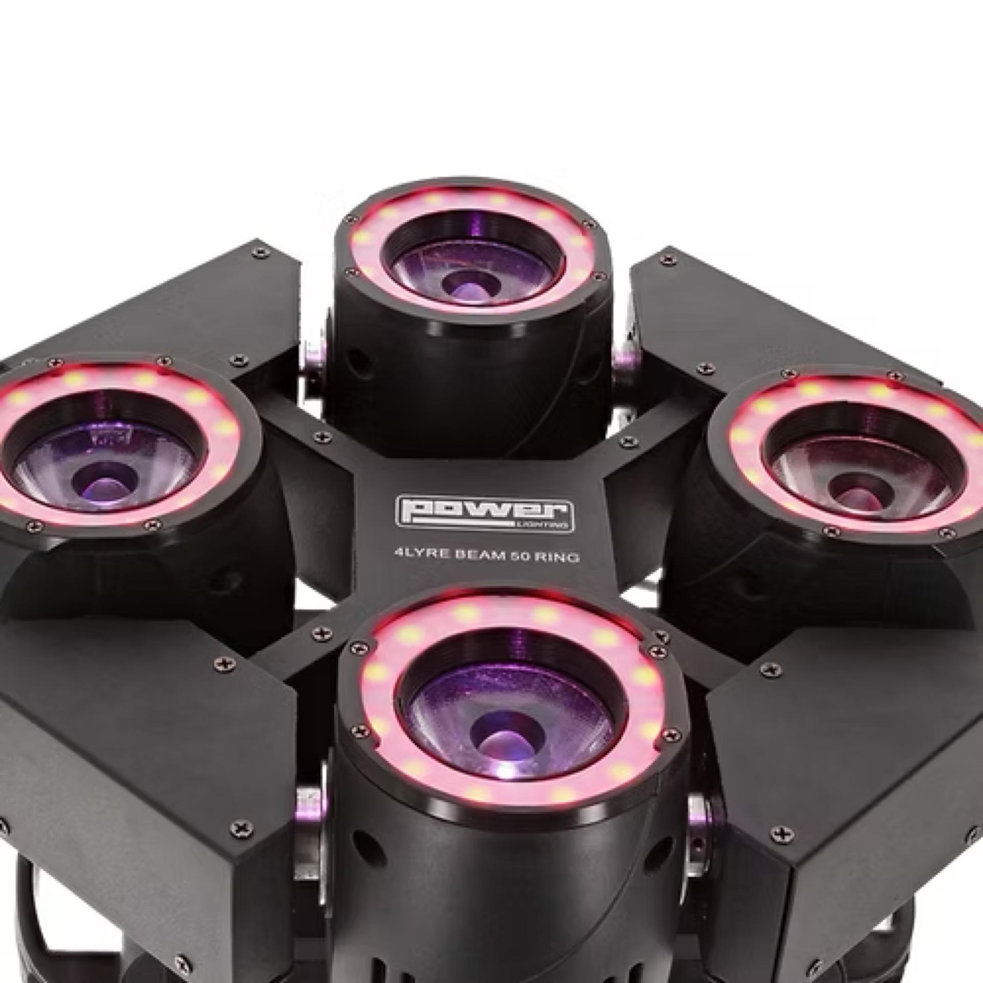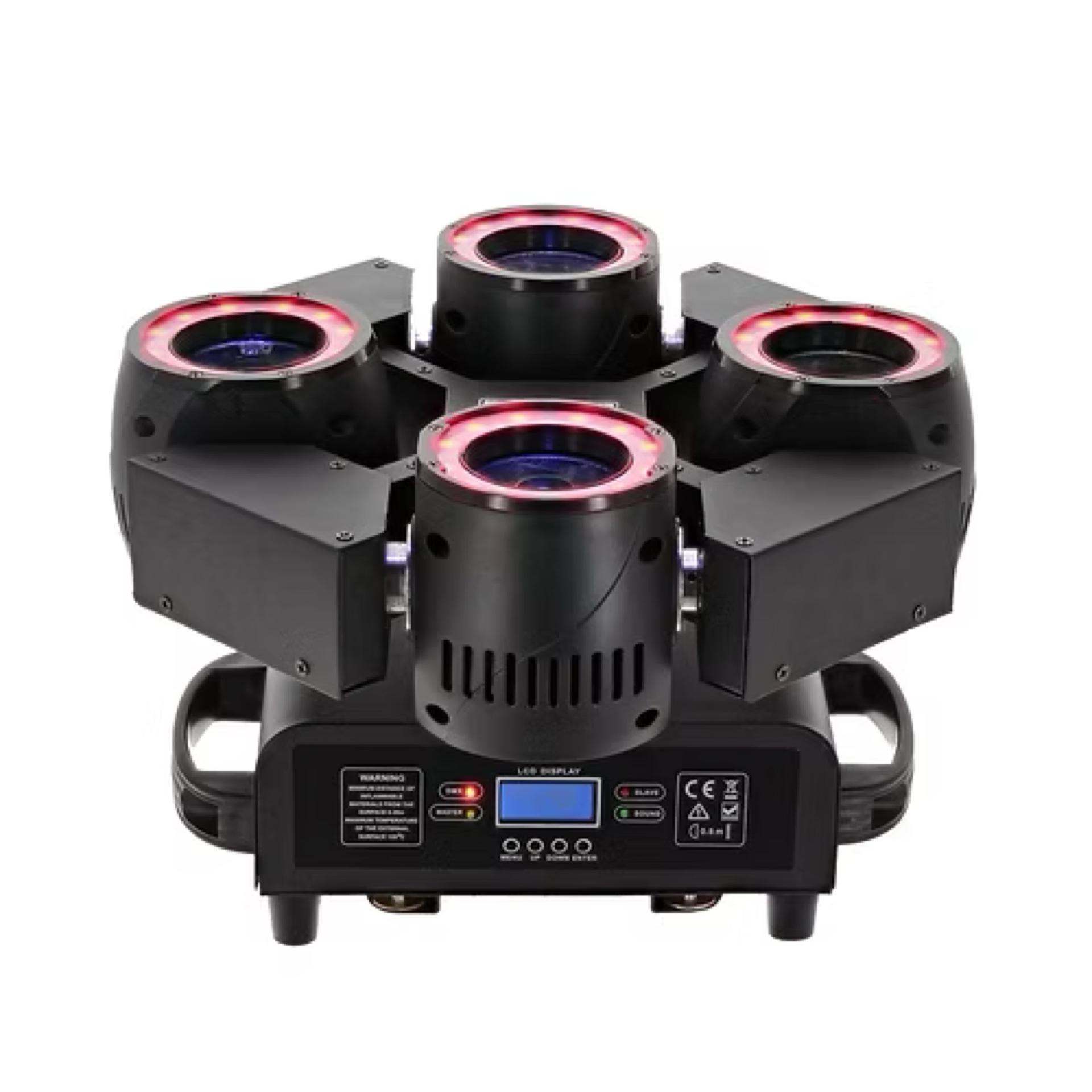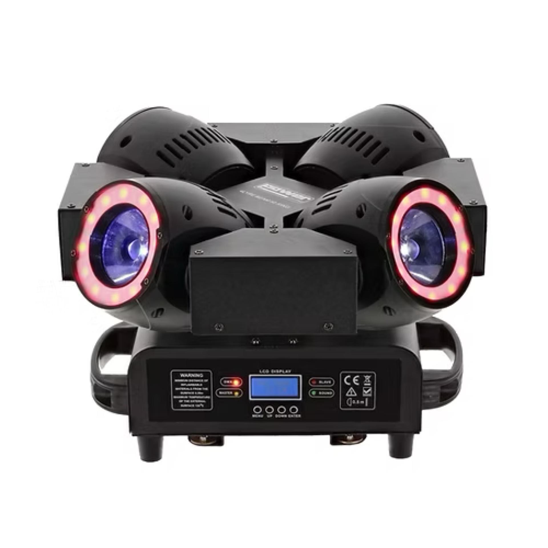 Quadruple lyre à faisceau beam dotée de 4 puissantes Leds de 50W RGBW 4-in-1 chacune couronnée d’anneau décoratif à led très novateur. Les mouvements rapides, la qualité des couleurs et les teintes obtenues permettent de produire de surprenants effets dynamiques. Elle est dotée d’un strobe, de deux modes DMX, d’un mode Auto et Musical. D’une efficacité redoutable. D’une efficacité redoutable, elle est idéale pour une installation en club, bar, scène et sera ravir les DJs et animateurs.