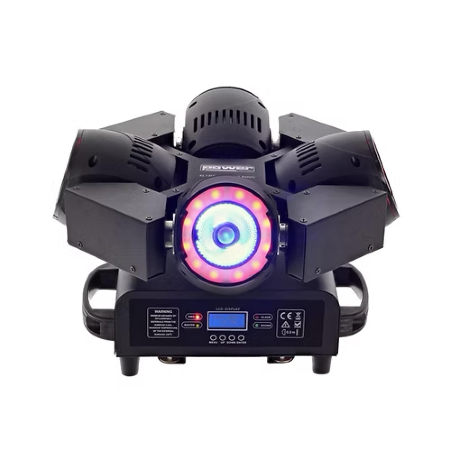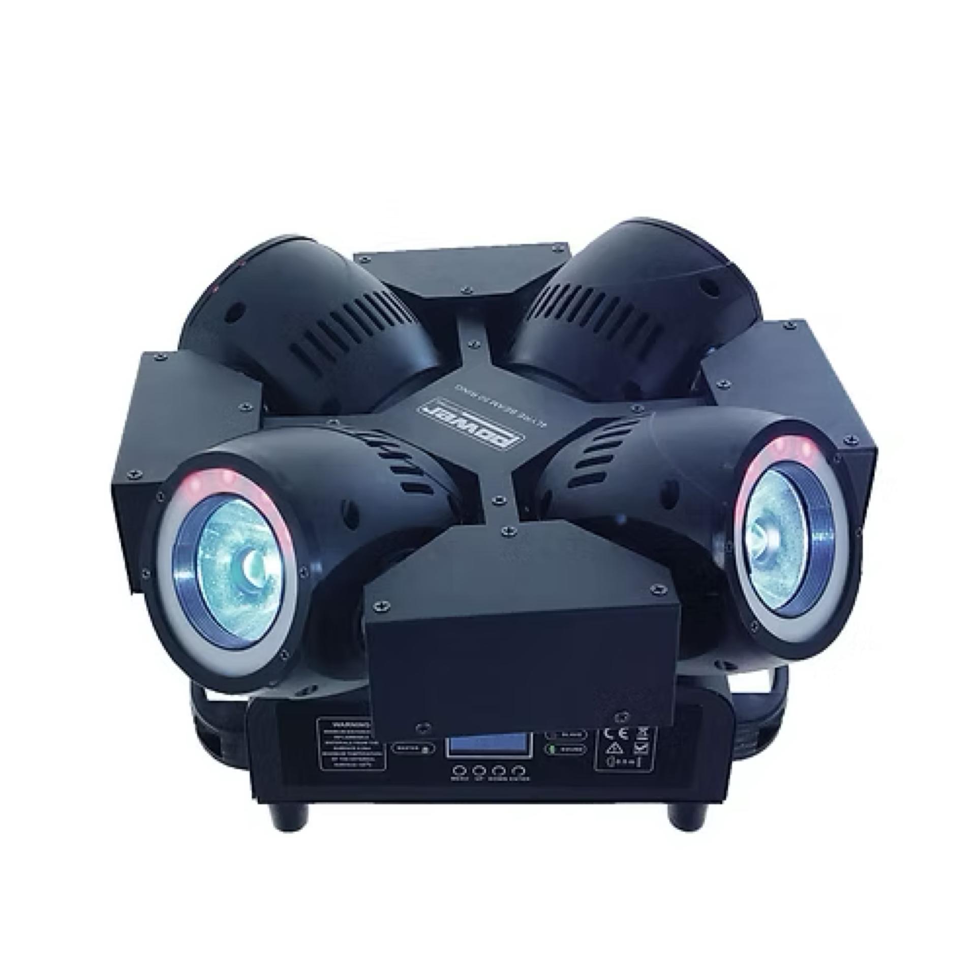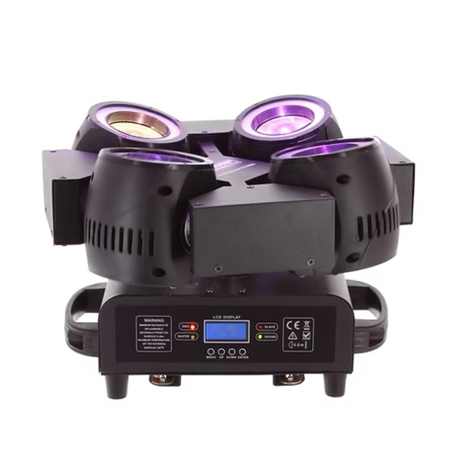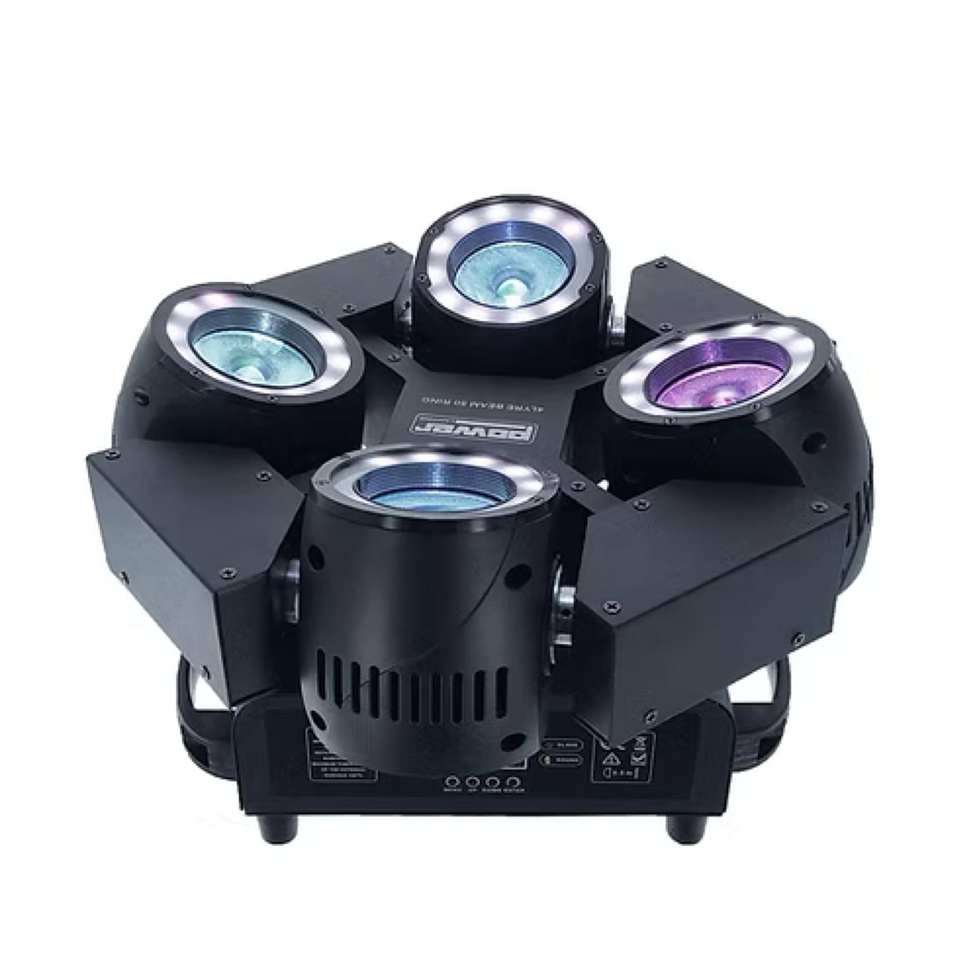 Quadruple lyre à faisceau beam dotée de 4 puissantes Leds de 50W RGBW 4-in-1 chacune couronnée d’anneau décoratif à led très novateur. Les mouvements rapides, la qualité des couleurs et les teintes obtenues permettent de produire de surprenants effets dynamiques. Elle est dotée d’un strobe, de deux modes DMX, d’un mode Auto et Musical. D’une efficacité redoutable. D’une efficacité redoutable, elle est idéale pour une installation en club, bar, scène et sera ravir les DJs et animateurs.