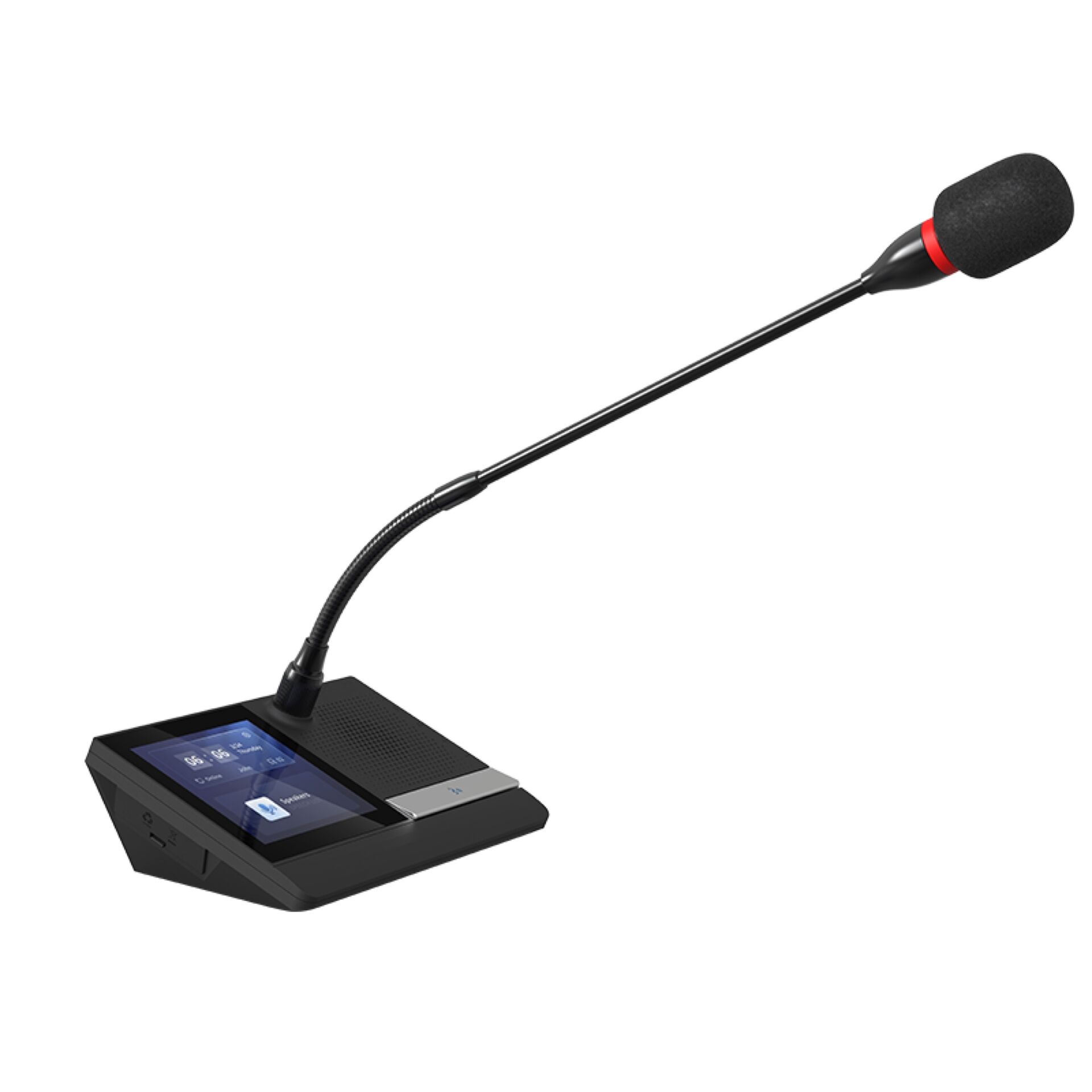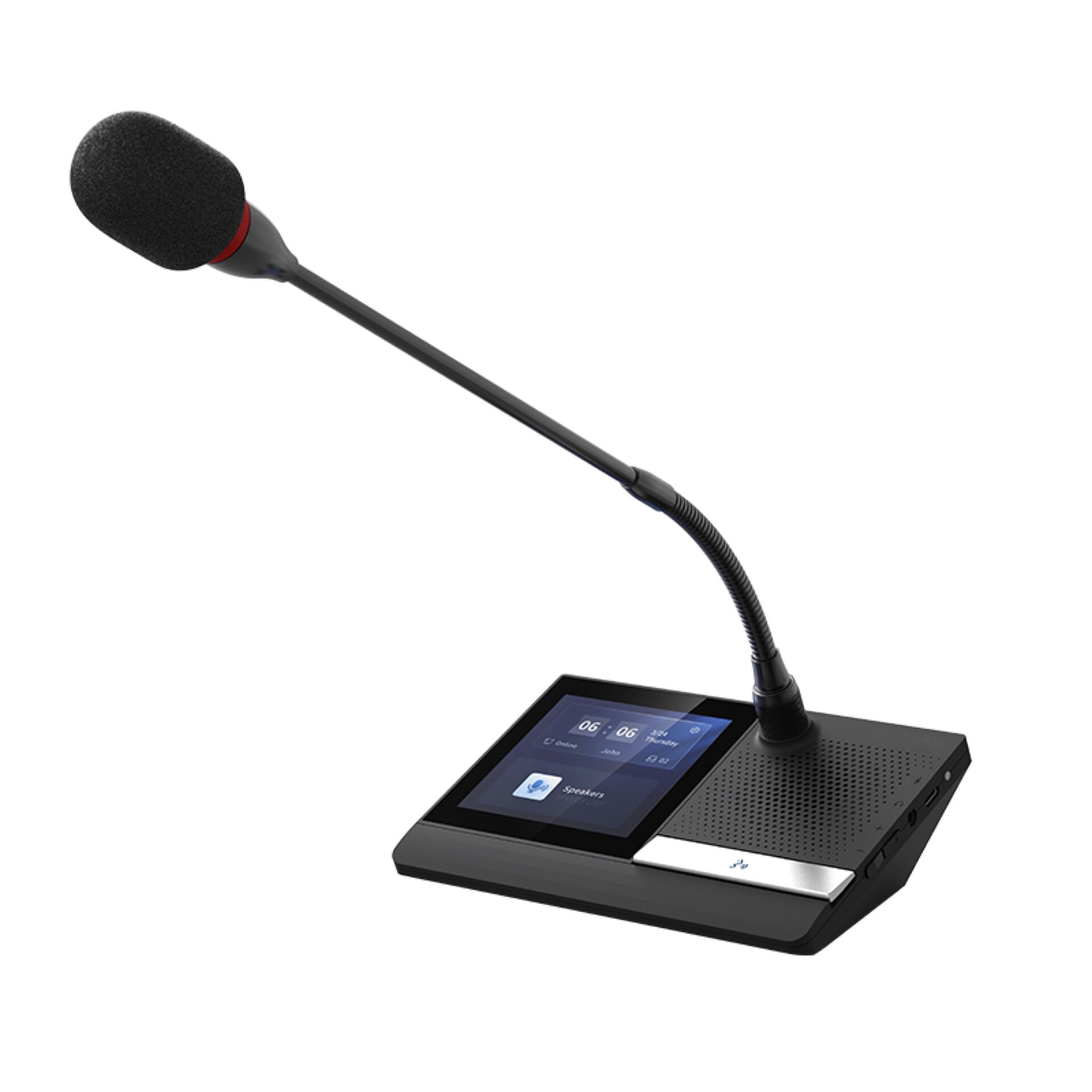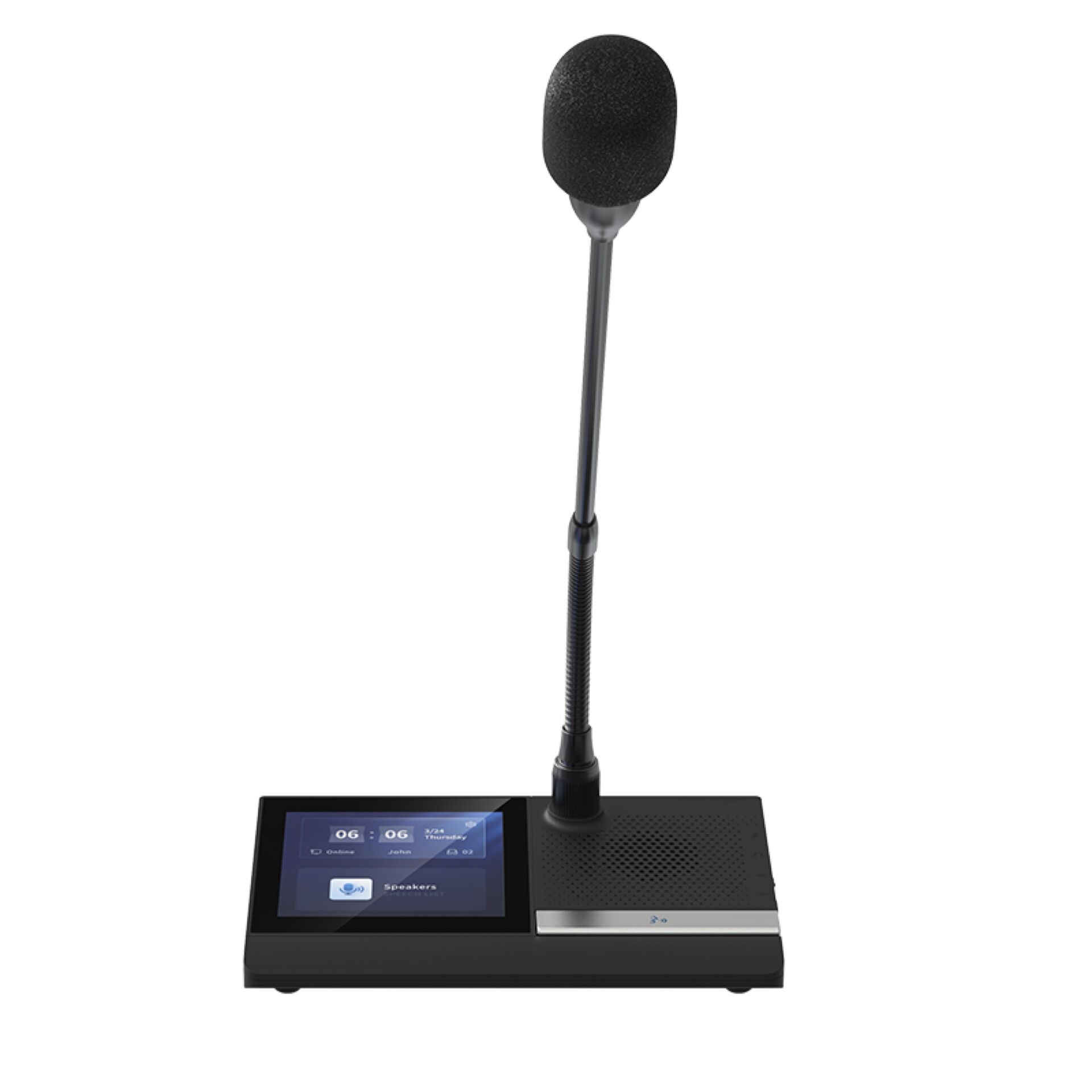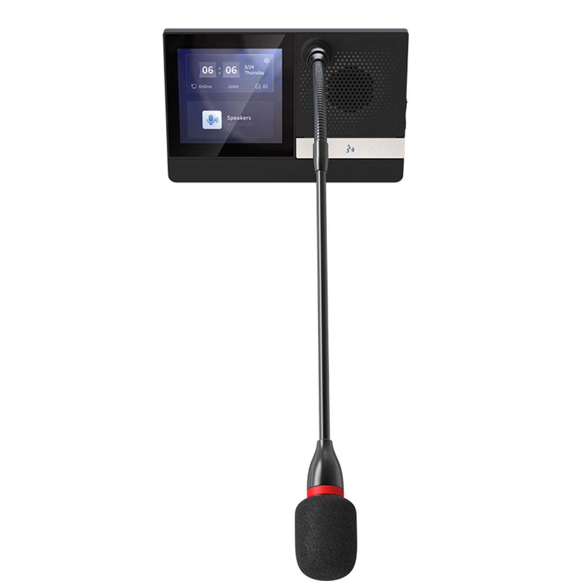 Son écran couleur tactile de 4" (480×480) facilite la participation : signature de présence, votes interactifs et affichage en temps réel du nom, du numéro de siège et du temps de parole de chaque intervenant. Trois touches tactiles intuitives offrent une utilisation simple et fluide.