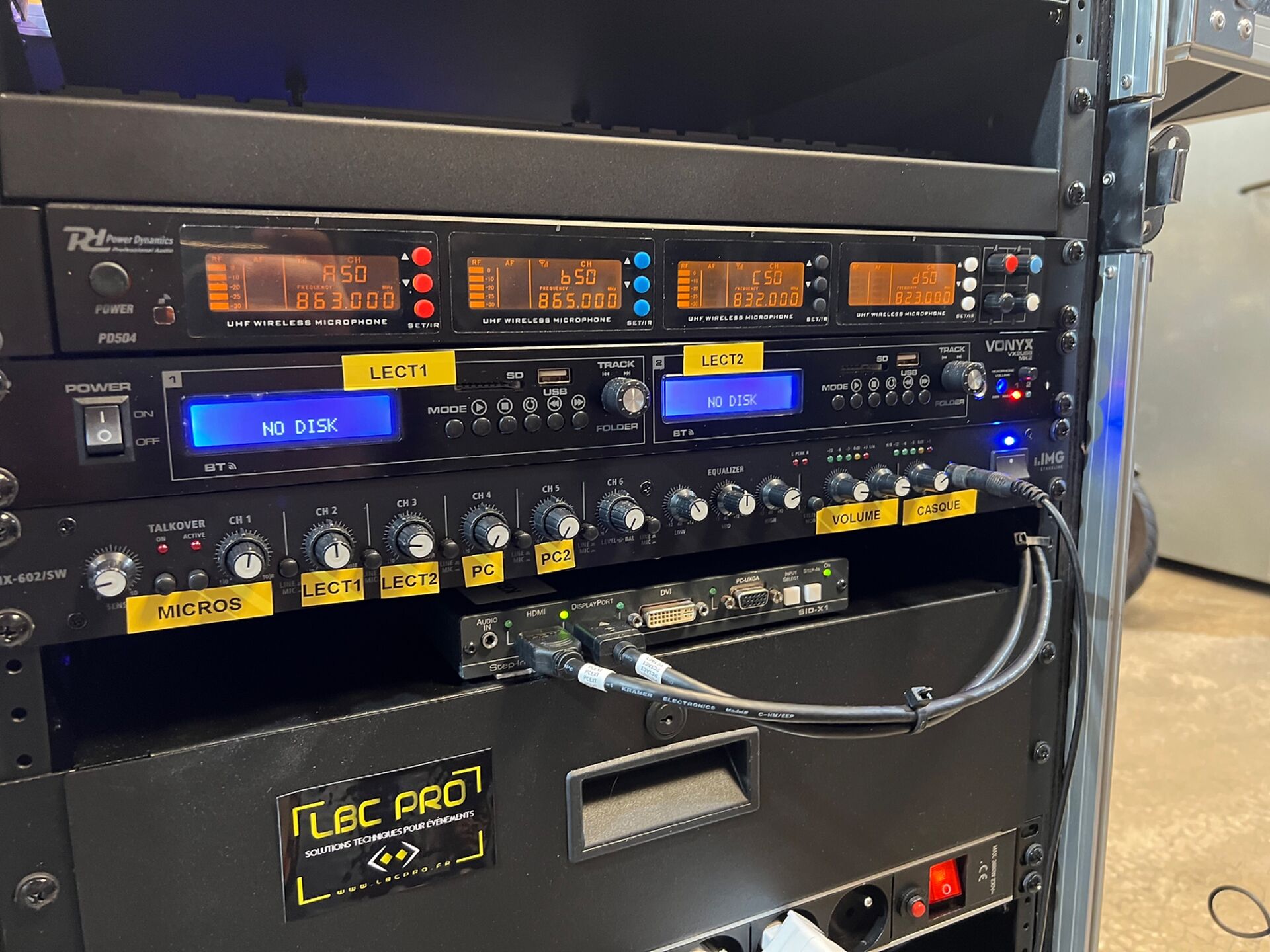 Mixette lineaire, 4 micros hf main, 2 enceintes jblonepro, lecteur audio sd usb bluetooth un casque
