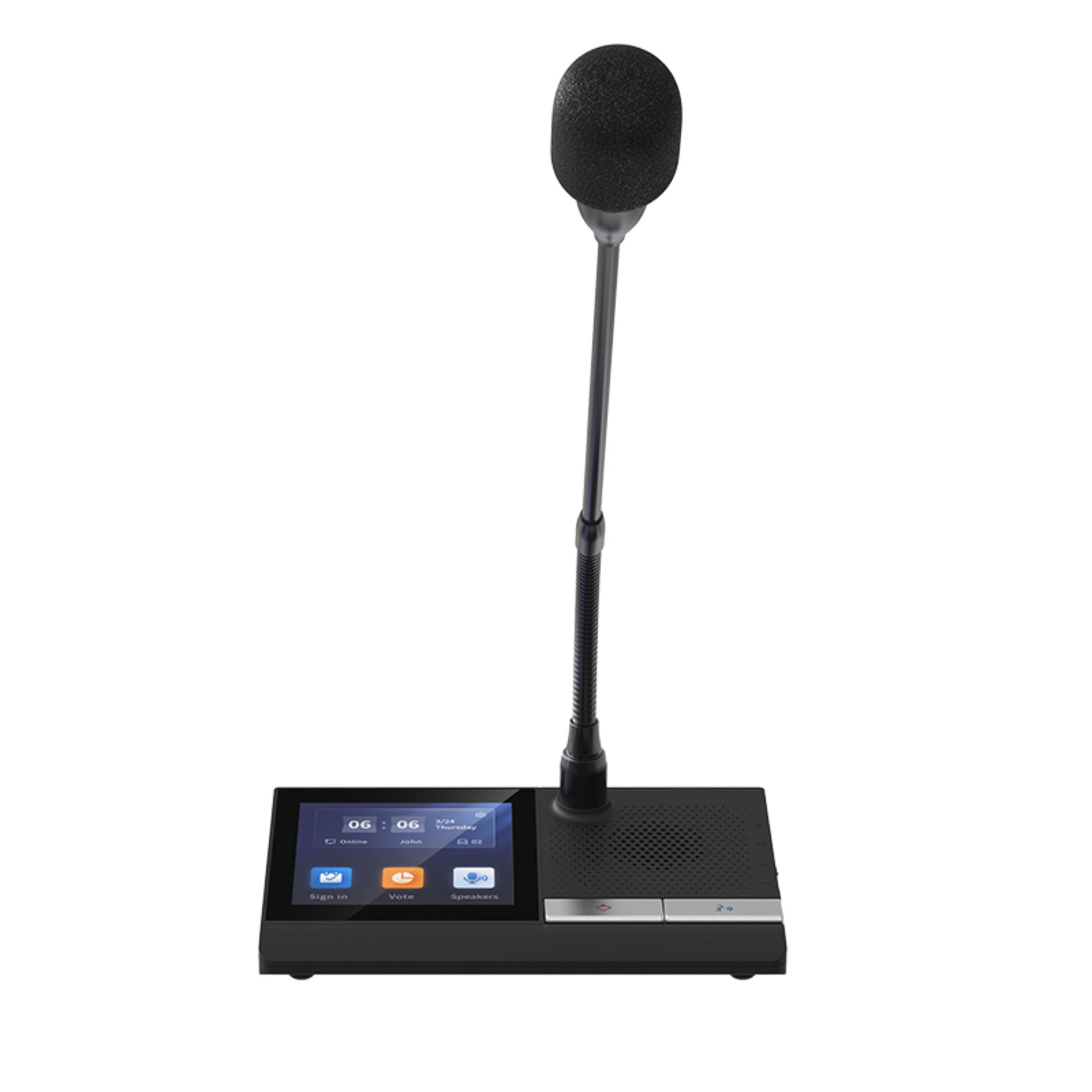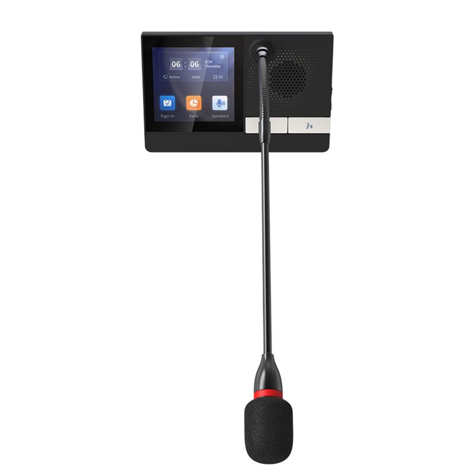 Son écran couleur tactile de 4" (480×480) facilite la participation : signature de présence, votes interactifs et affichage en temps réel du nom, du numéro de siège et du temps de parole de chaque intervenant. Trois touches tactiles intuitives offrent une utilisation simple et fluide.