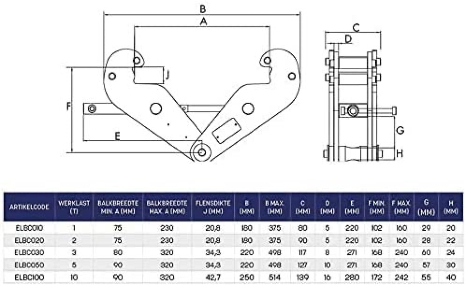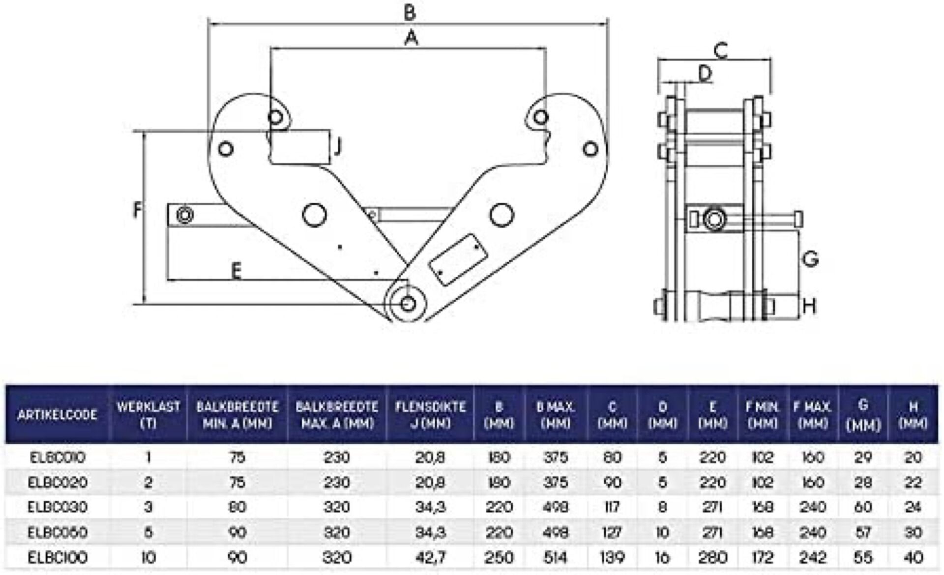 Pince de support pour palan 2t / 2000kg - Largeur de bride de support 75-230mm