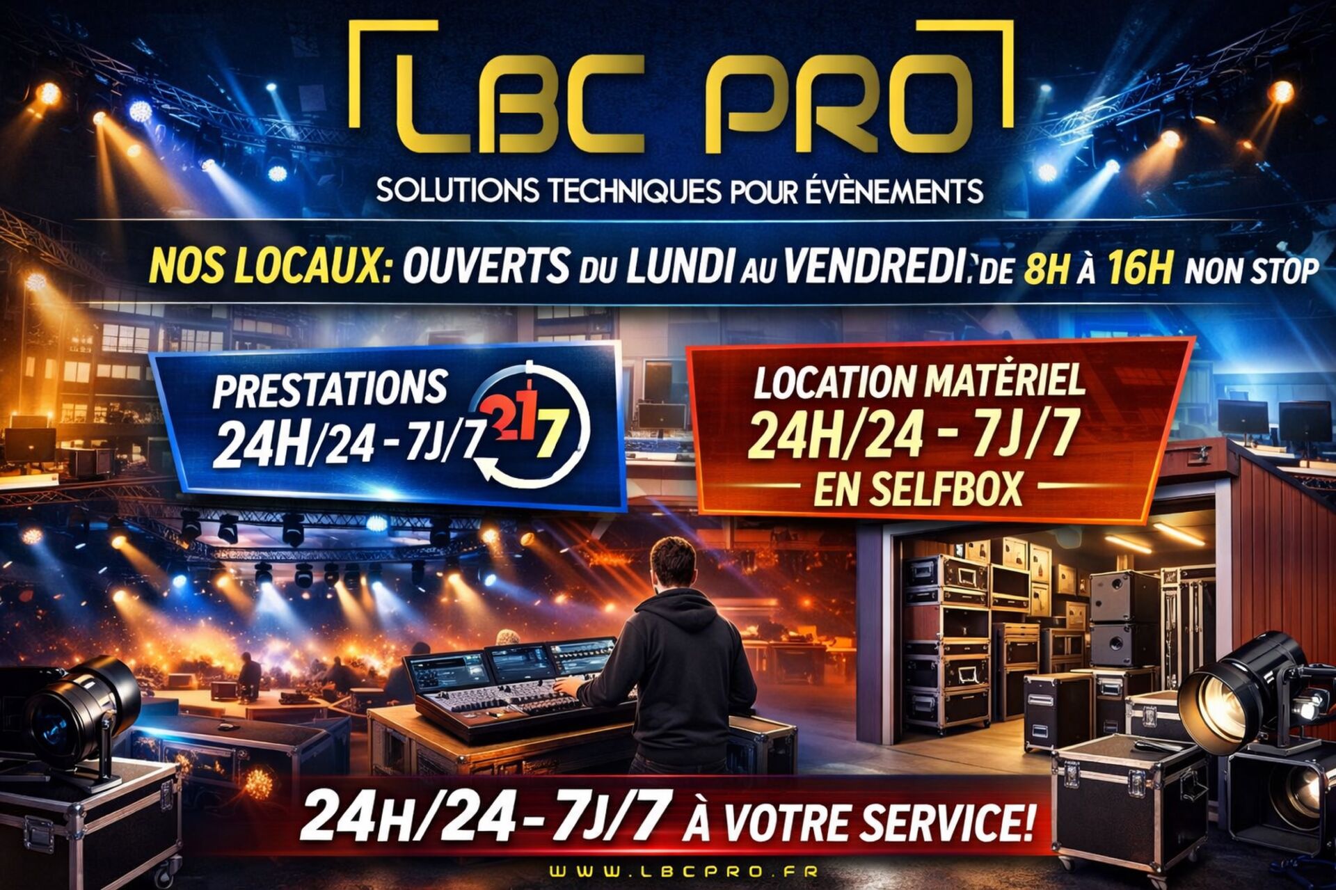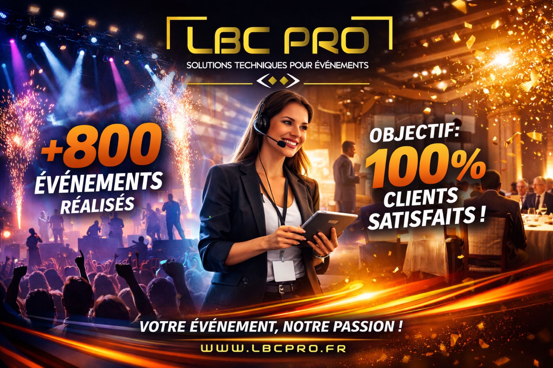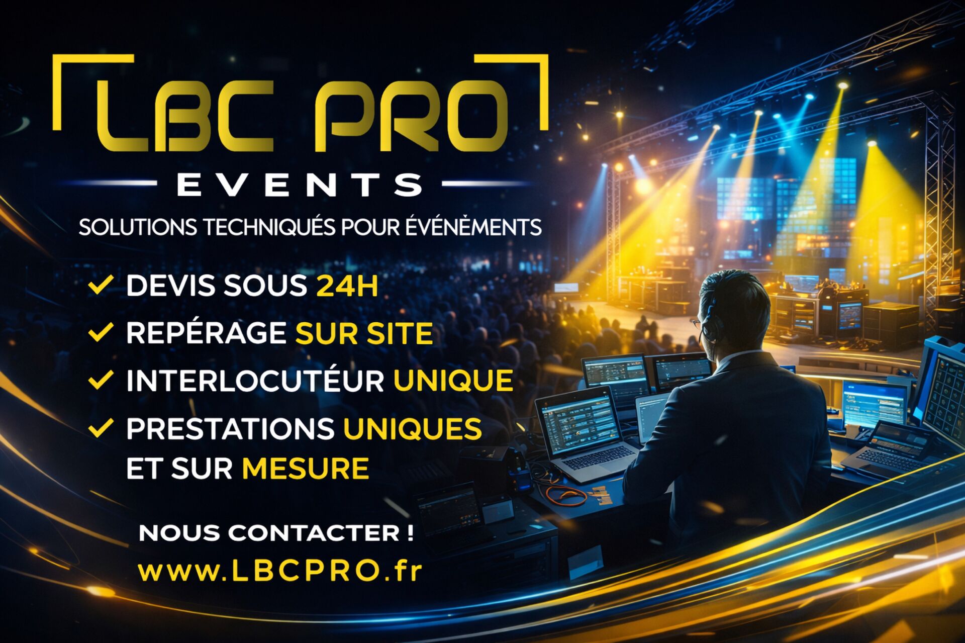 Chez LBC PRO EVENTS, nous nous engageons à vous proposer des événements sur mesure et de qualité. Grâce à nos équipes, nous prenons en charge l’ensemble de la partie technique, vous offrant ainsi une expertise fiable et professionnelle à chaque étape.