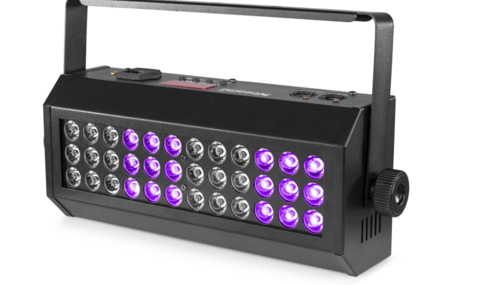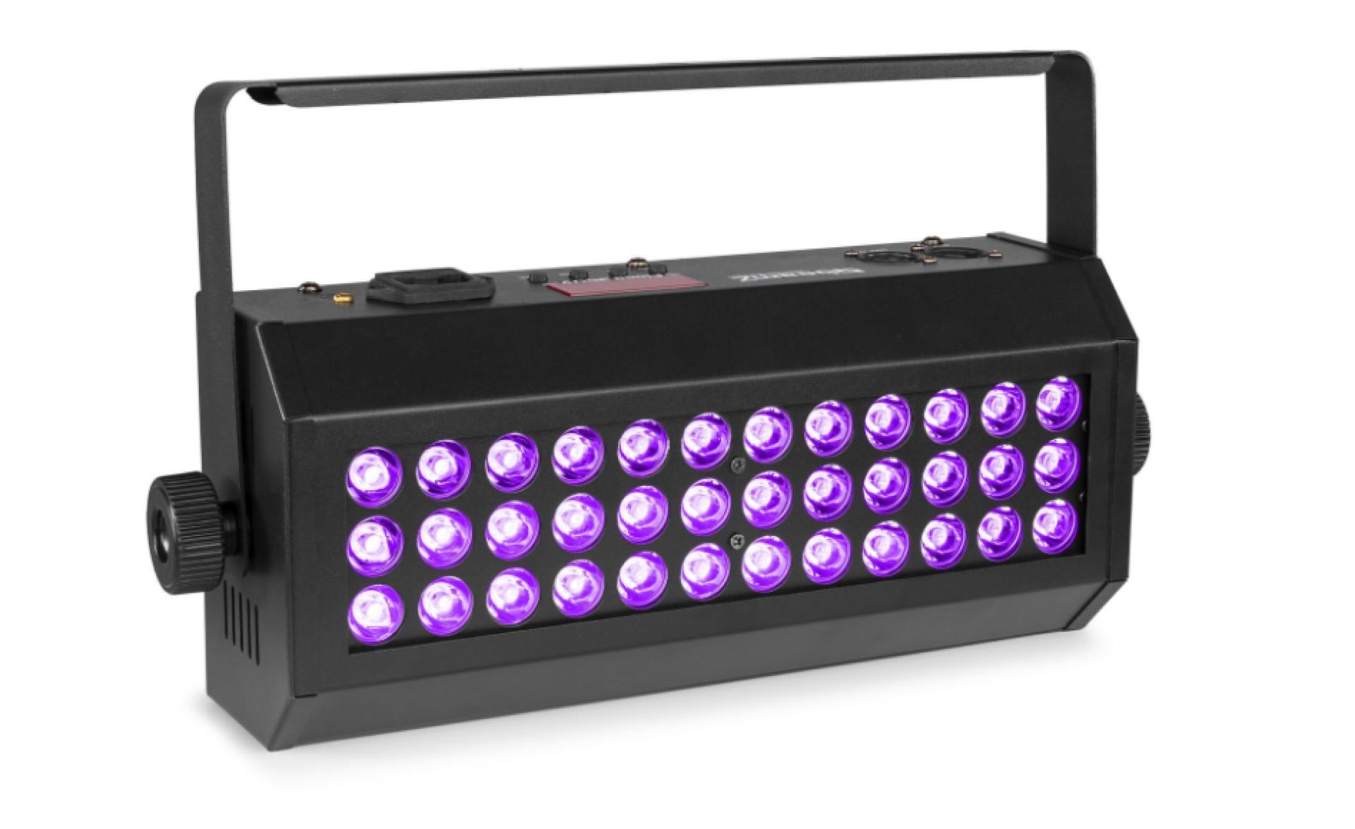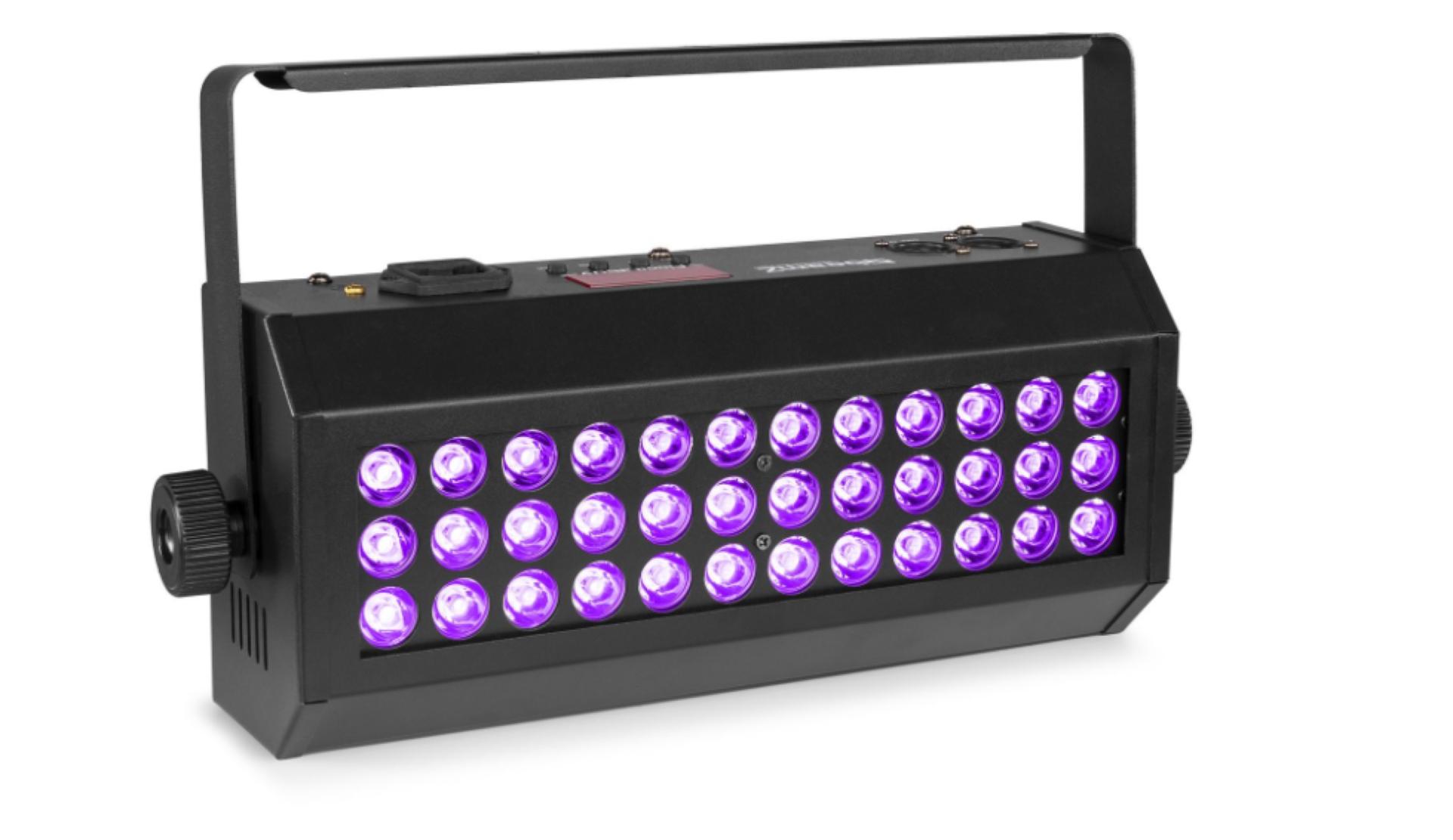 Le Flood36UV est un projecteur à LEDs puissant, doté de LEDs UV à haut rendement. Ces 36 LEDs UV de 3 W feront briller les objets et les personnes dans le noir. L'intégration DMX complète, la fonctionnalité Sound-to-Light via un microphone intégré ainsi qu'un mode Maître/Esclave répondront à tous vos besoins ! Convient pour toutes sortes de spectacles et d'événements.