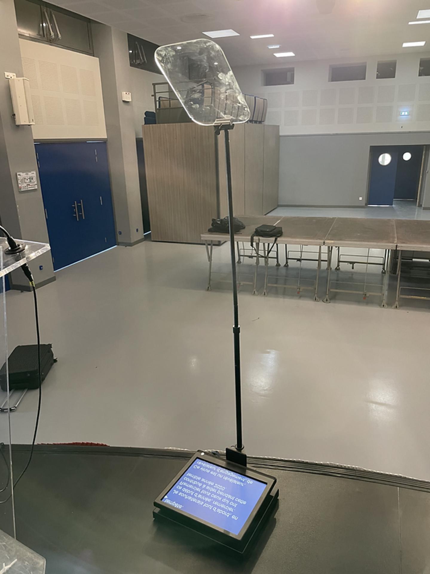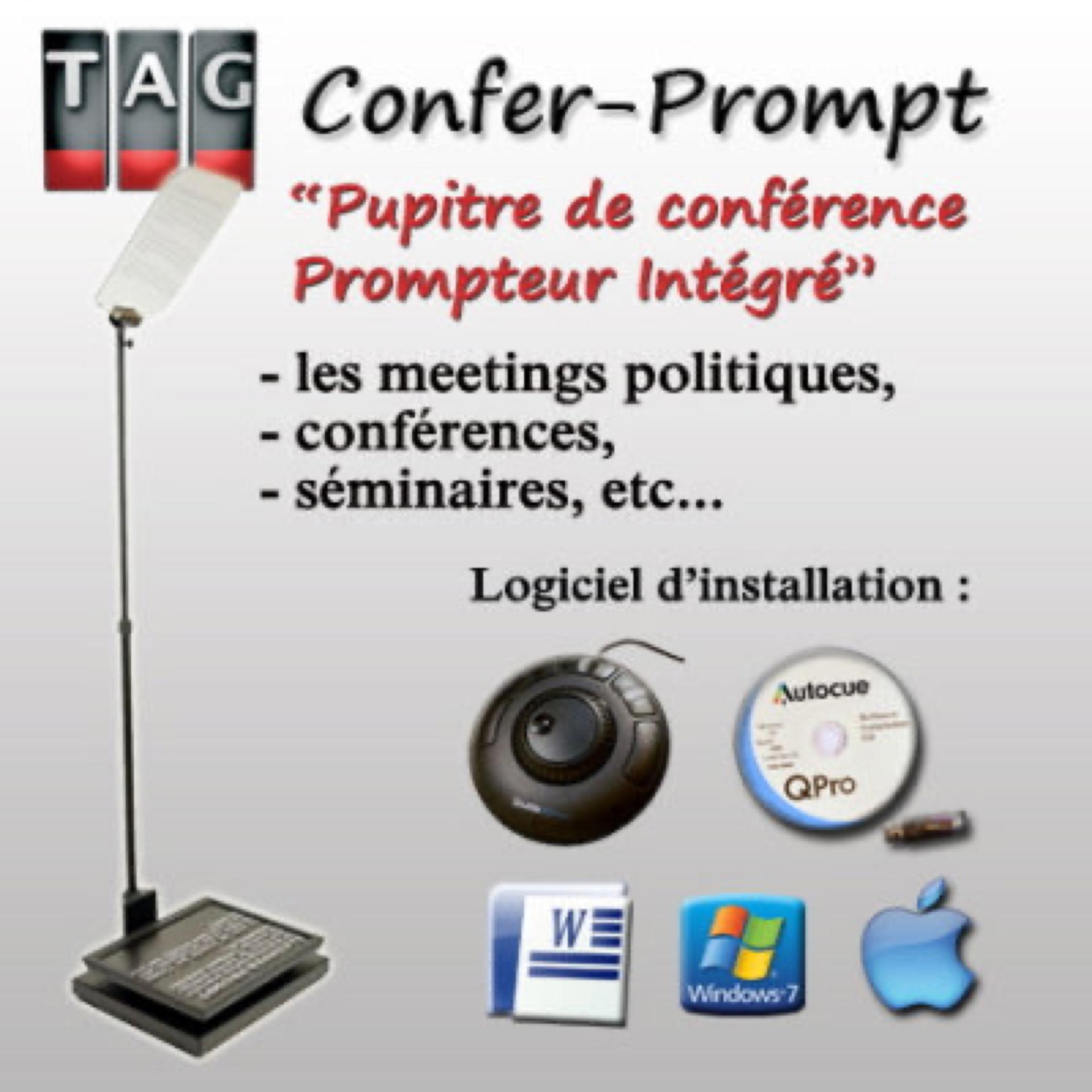 Le CONFER-PROMPT-AUT a été étudié pour les conférences ou tous les évènements où un orateur s’adresse à un public. Lorsqu’il est installé, le prompteur ressemble à un pied de micro ayant à son sommet un miroir. Vu du public le miroir de haute qualité est transparent et donne l’impression que l’orateur parle de manière tout à naturelle et sans assistance aucune. Pour l’orateur le miroir affiche le discours préparé.