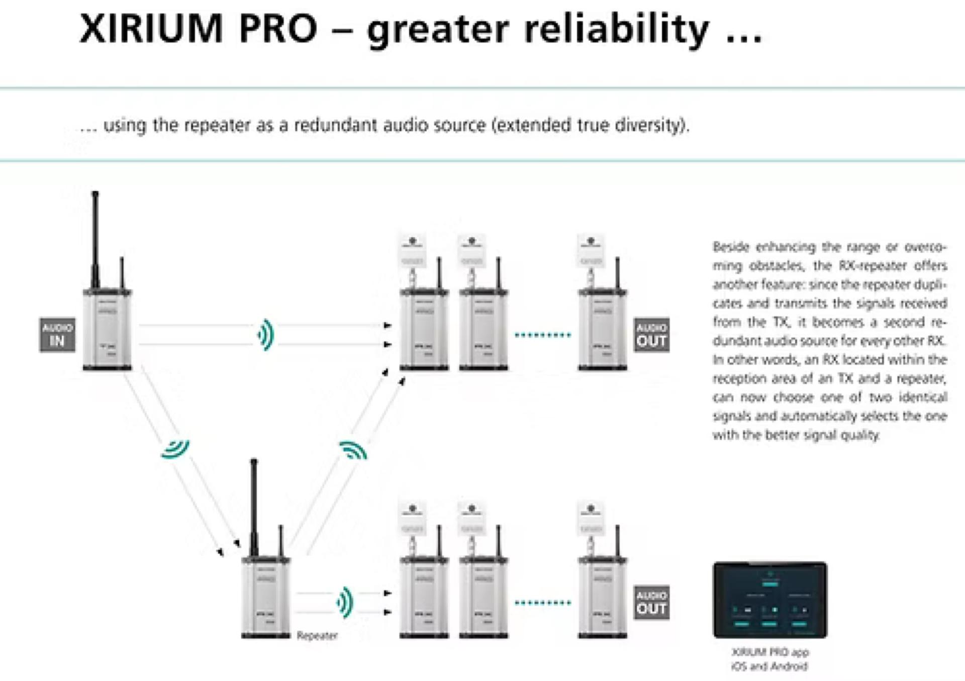 XIRIUM PRO utilise une transmission numérique pour, la meilleure qualité sonore possible, la fiabilité et des performances exceptionnelles. C'est une véritable alternative et un gain de temps lorsqu'il n'est pas possible d'utiliser des câbles pour relier deux points. Avec DIWA (Audio numérique sans fil) Neutrik a développé une technologie de transmission de données numériques qui offre une haute fidélité sans compression de données. Le flux audio numérique non compressé de 24 bits / 48 kHz nécessite une bande passante de 1,15 MHz. Une telle quantité de données ne peut pas être transmis dans la bande UHF, sans l'aide d'un compander. En choisissant la bande des 5 GHz, XIRIUM PRO fournit une bande passante de 20 MHz. Cette technologie sans fil permet aux signaux audio d'être transmis avec un niveau de qualité digne d'un studio d'enregistrement.