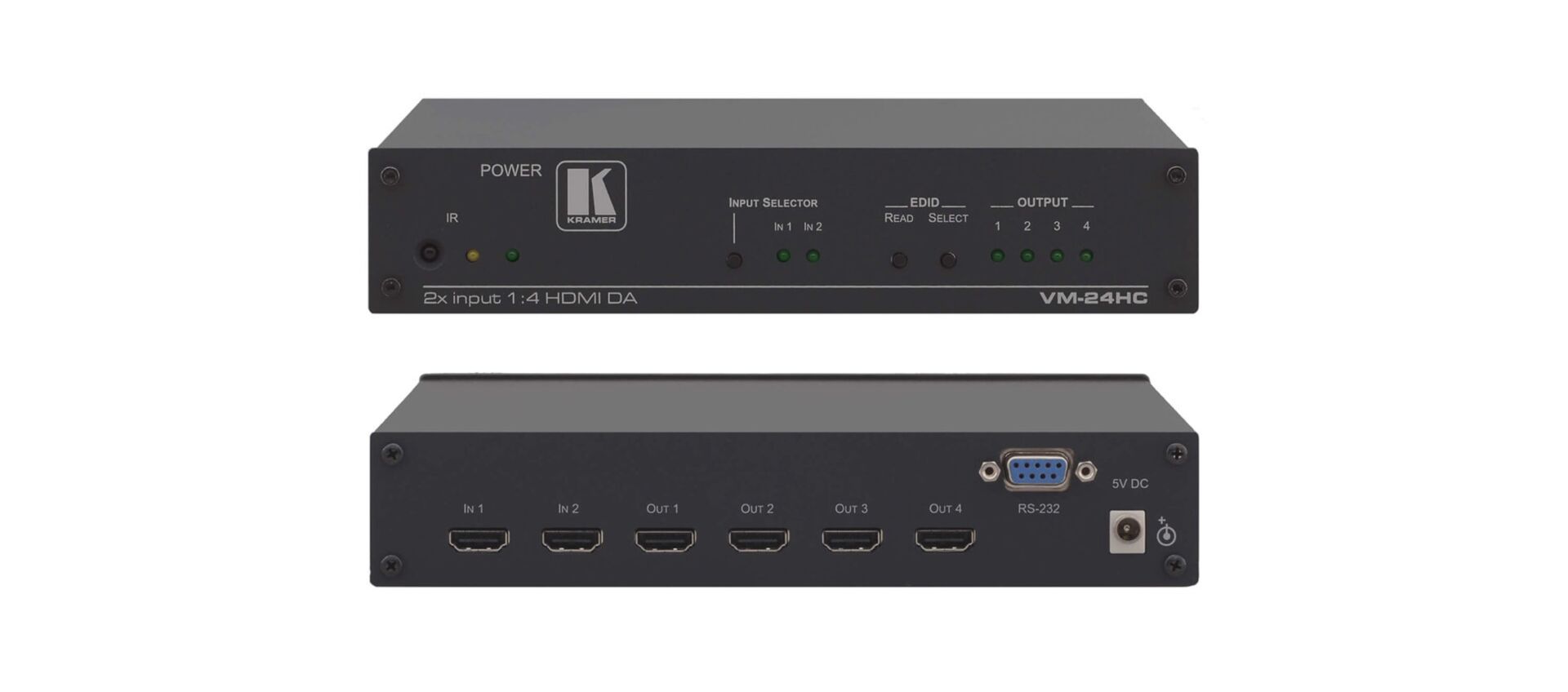 Le VM−24HC est un sélecteur et distributeur amplificateur haute performance pour les signaux HDMI. Le produit accepte une des deux entrées HDMI et distribue le signal sélectionné vers quatre sorties HDMI.