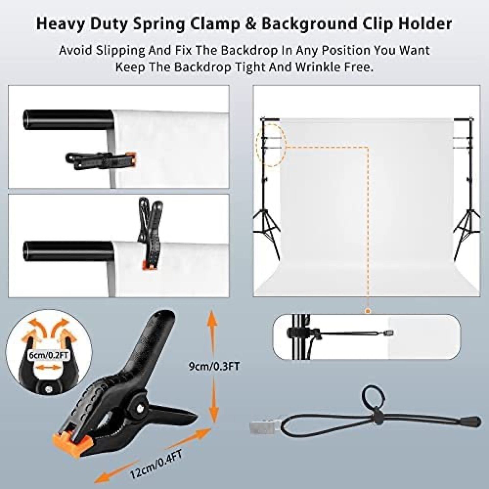 ????【4 x PINCES À RESSORT & 4 x BACKDROP CLAMP CLIP】: Pour votre utilisation plus pratique de notre toile de fond, nous sommes équipés de 4 pinces à ressort et 4 backdrop clamp clip pour lui. Le clip à ressort peut fixer fermement le tissu photographique sur le support de tissu de fond pour empêcher le tissu de fond de glisser. La backdrop clamp clip maintient le tissu d'arrière-plan serré et réduit les plis.