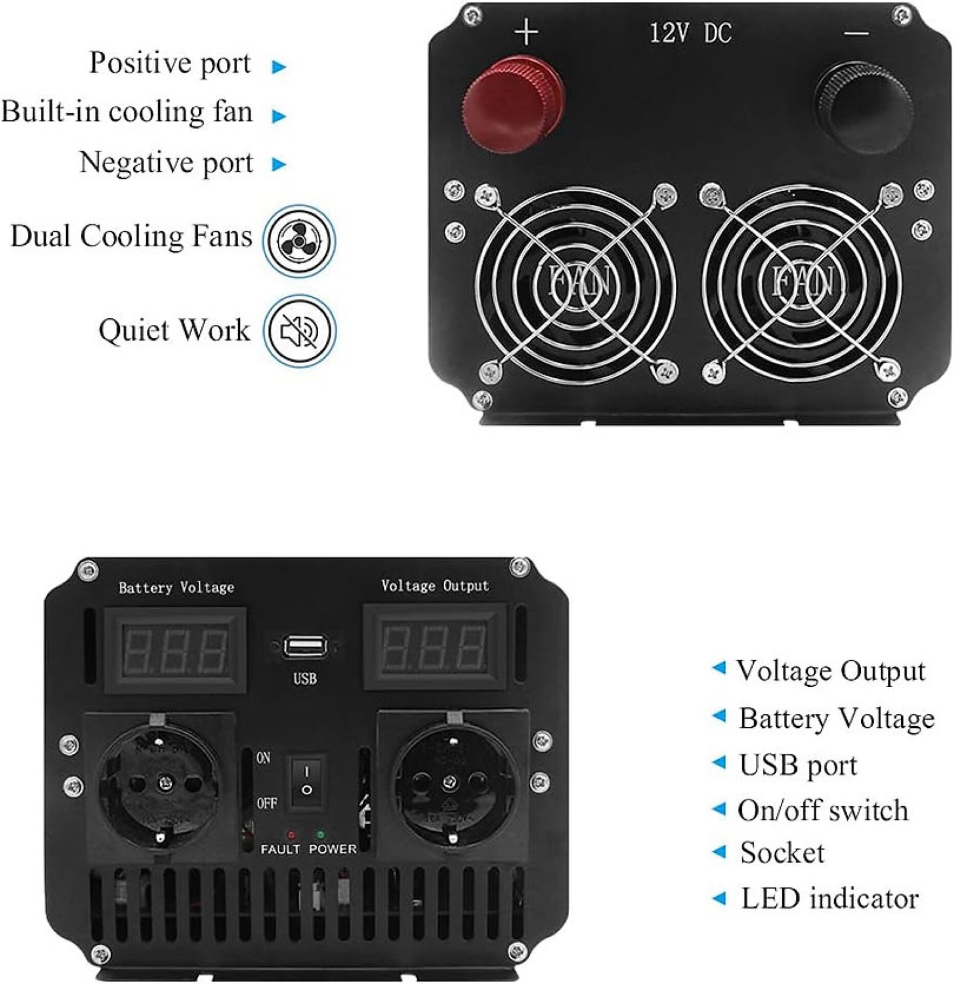 Ce convertisseur à onde sinusoïdale modifiée est très robuste, fonctionne avec un refroidissement par ventilateur contrôlé par la température (fonctionnement au-dessus de 45°C) et est extrêmement efficace et donc également adapté à un fonctionnement continu.