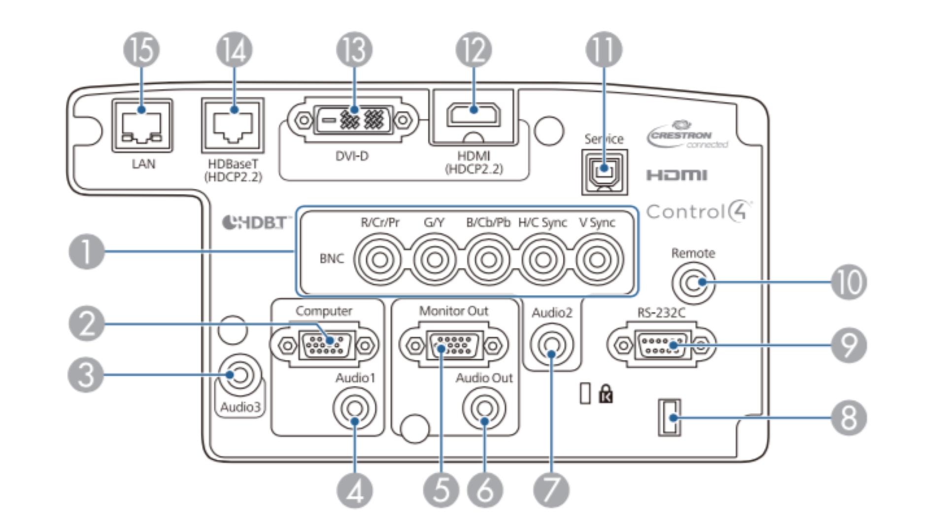 USB 2.0 type A, USB 2.0 Type B (Service Only), RS-232C, Interface Ethernet (100 Base-TX/10 Base-T), Réseau local sans fil IEEE 802.11a/b/g/n (en option), Entrée VGA, Sortie VGA, Entrée DVI, Entrée BNC, HDBaseT, Sortie audio mini-jack, Entrée audio mini-jack (3x), HDMI (HDCP 2.2)